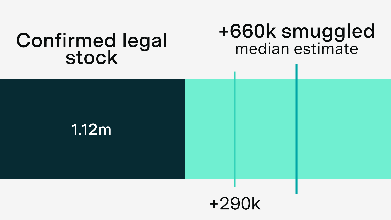 We estimate that between 290,000 and 1.6 million H100-equivalents (H100e) were smuggled to China through 2025. Our median estimate of 660,000 H100e would be roughly a third of China's total compute.