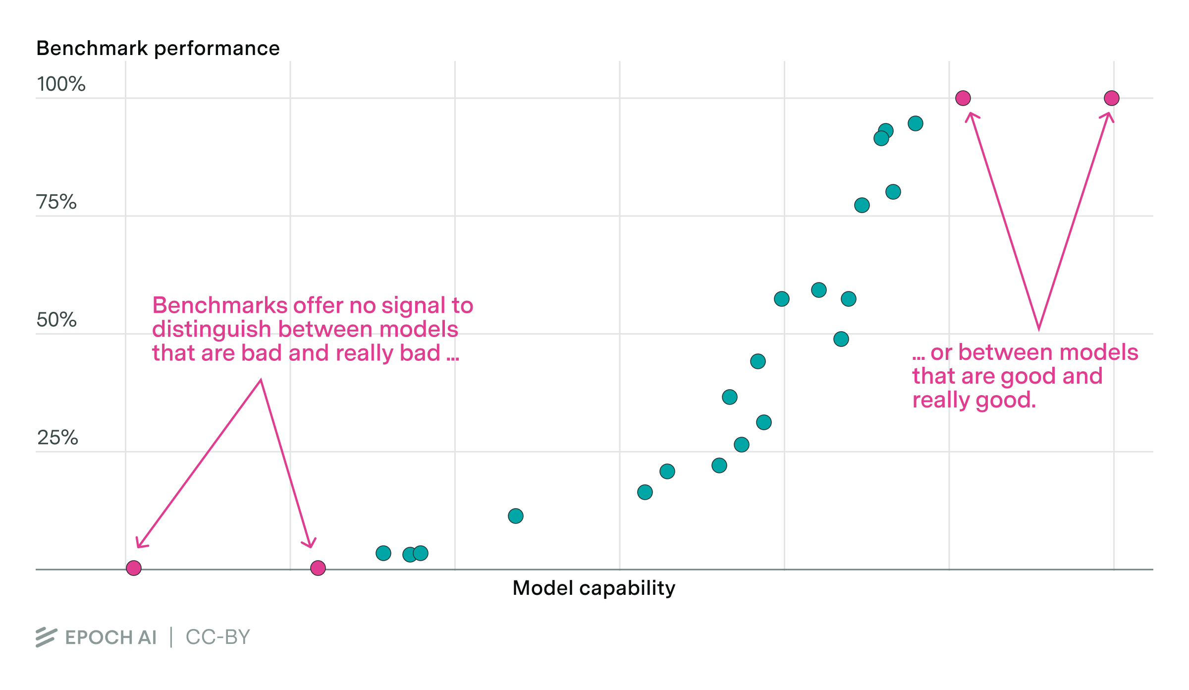 Consider a benchmark. If a model is really bad, it will score 0% on the benchmark. But the same is true for a model that’s extremely bad — the benchmark offers no signal to distinguish these two models, even though one is much better than the other.