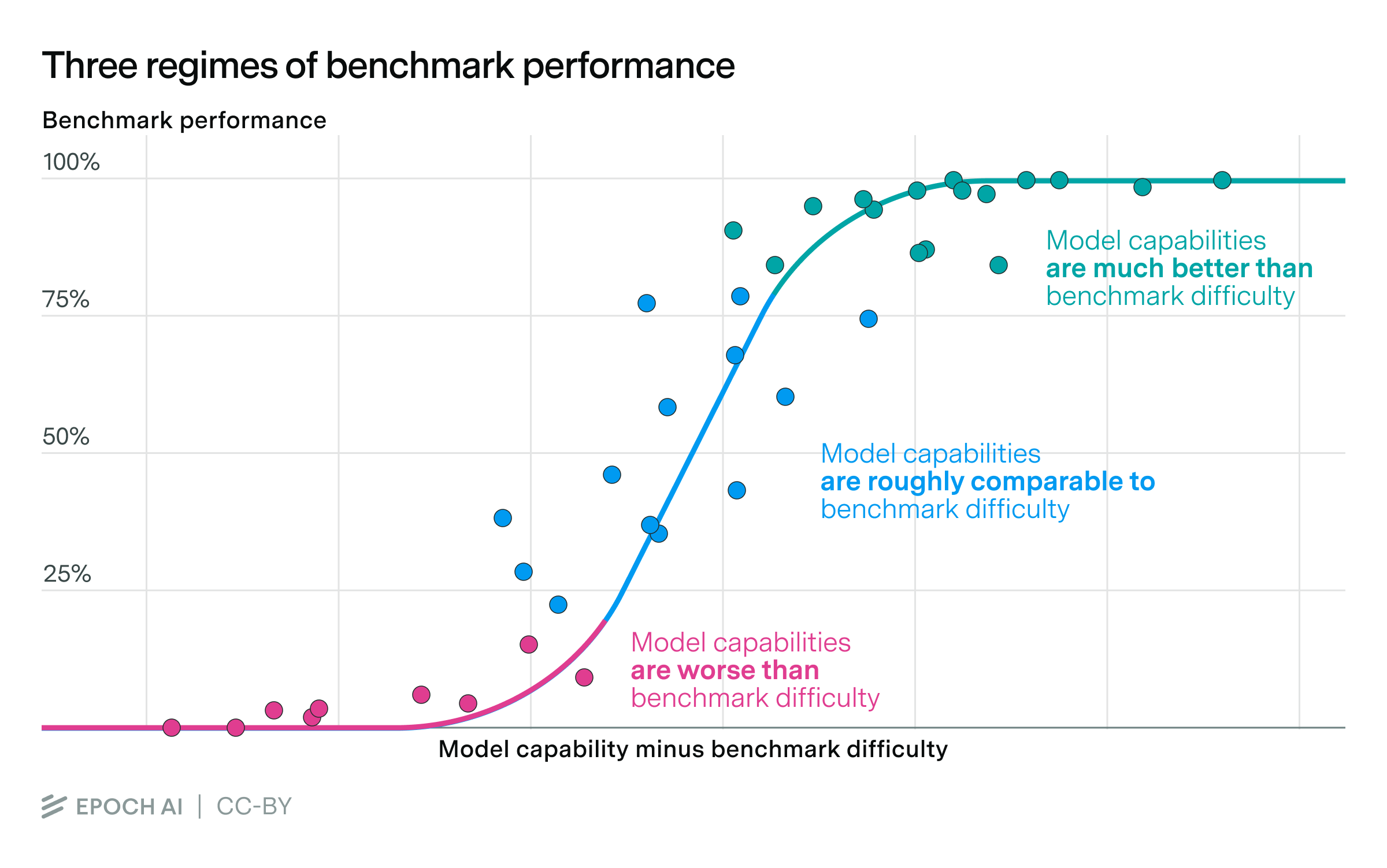 - Model capability is much greater than benchmark difficulty: The model is now too capable for the benchmark, which is saturated at (or close to) 100%.