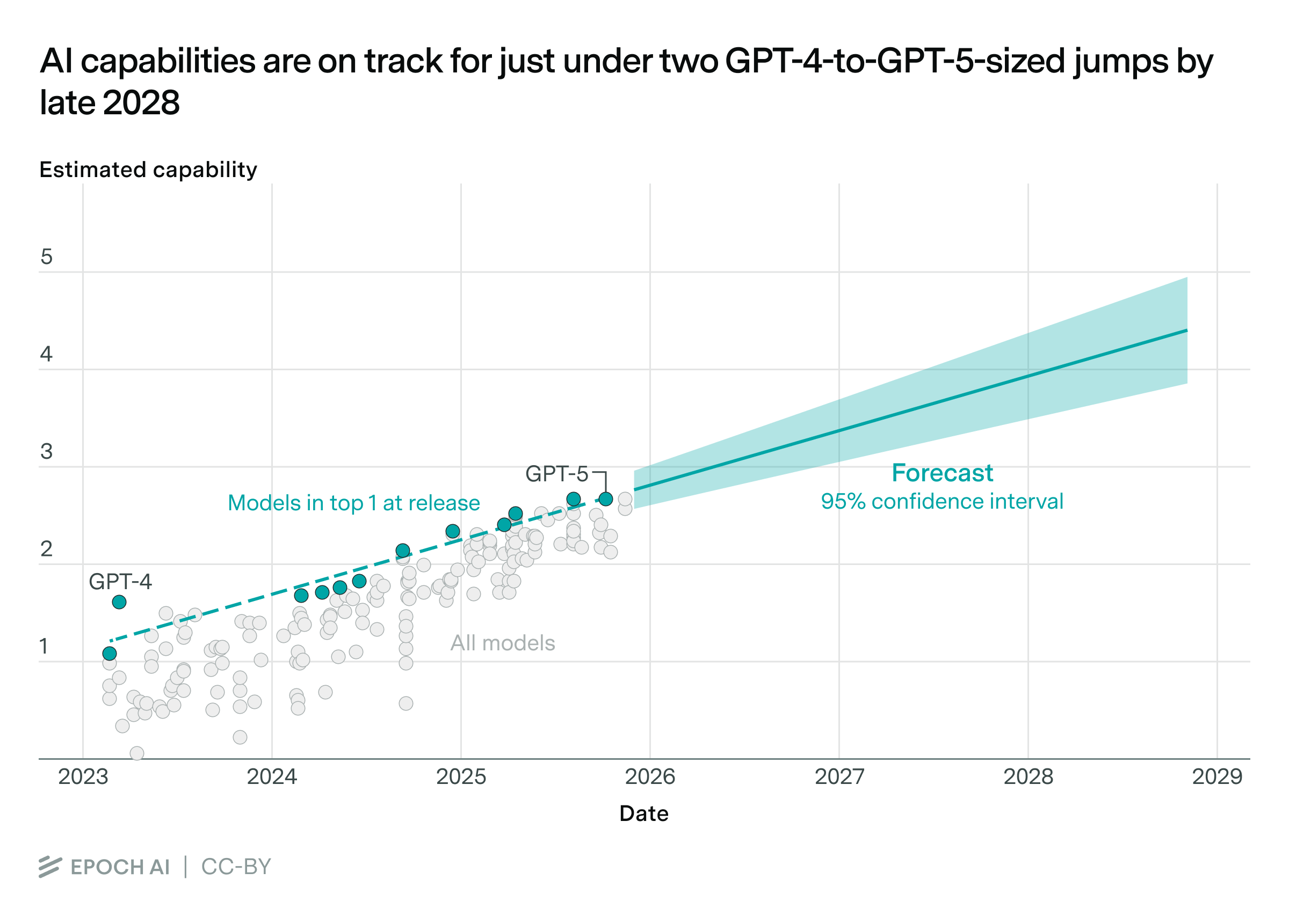 Our framework also lets us see how model capabilities have changed over time. On average, across models that push the state of the art in capabilities, the annual improvement is about 0.6 units per year. That’s as big of capabilities improvement that took place from GPT-4.5 to GPT-5.