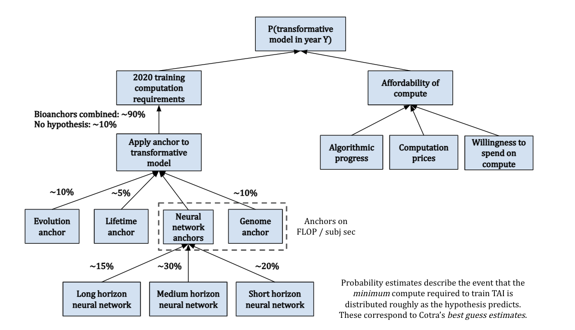 Diagram summarizing Ajeya Cotra’s biological anchors model.
