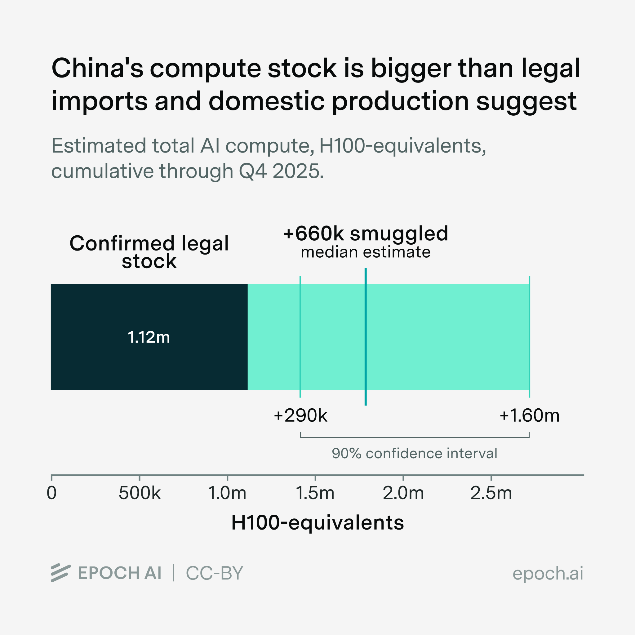 - We estimate, with 90% confidence, that between 290,000 and 1.6 million H100-equivalents of compute were smuggled through the end of 2025. Our median estimate of 660,000 represents roughly 3% of the global compute stockpile, comparable to what xAI, a leading US AI lab, had at the time. The upper bound of our estimate would mean that, by the end of 2025, the majority of China’s AI compute had been smuggled.