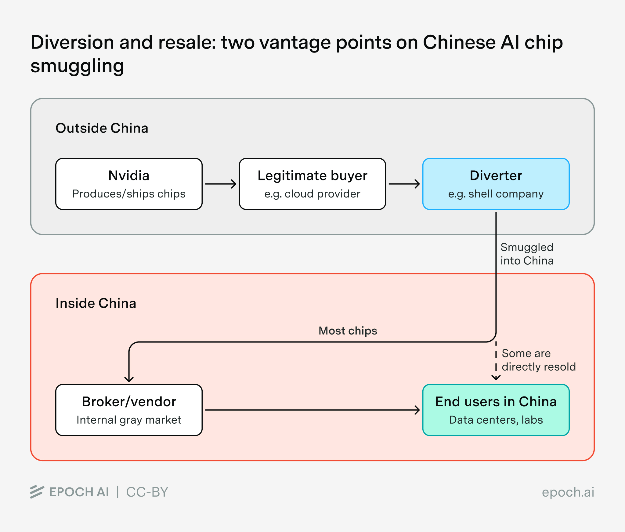 In some cases, the end user may be directly arranging for the diversion of the chips, typically through a shell company or other pass-through entity. We then consider the transfer of the chips from the pass-through entity to the end user to be the resale step. It is possible that some chips may be smuggled in more directly by the end-user, but we anticipate that this is small in proportion to total flows.