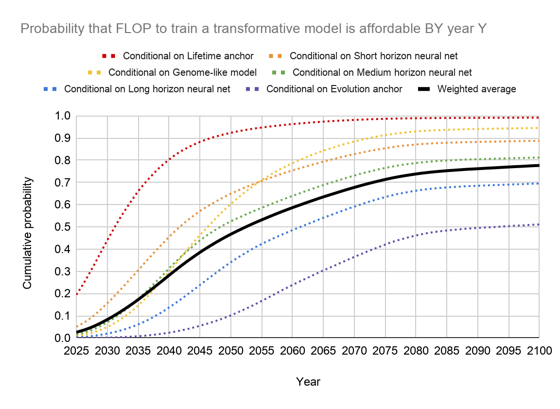 - Lifetime anchor: The compute required to train a transformative model is roughly the compute performed as a child matures, from birth to 32 years old. Under this hypothesis, we should expect machine learning architectures to be roughly as efficient as human learning.