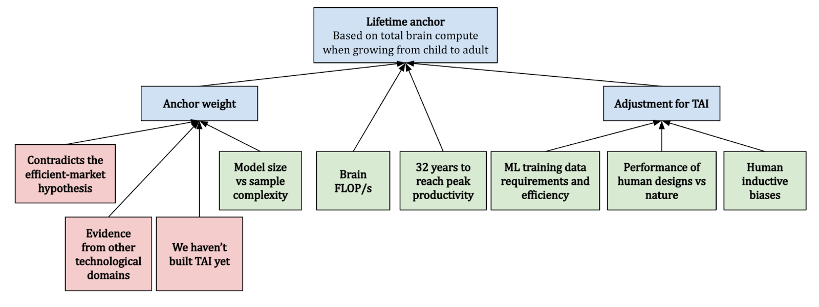 - Lifetime anchor: Compute to train TAI = Compute performed by the human brain when maturing to an adult (0 to 32 years old)