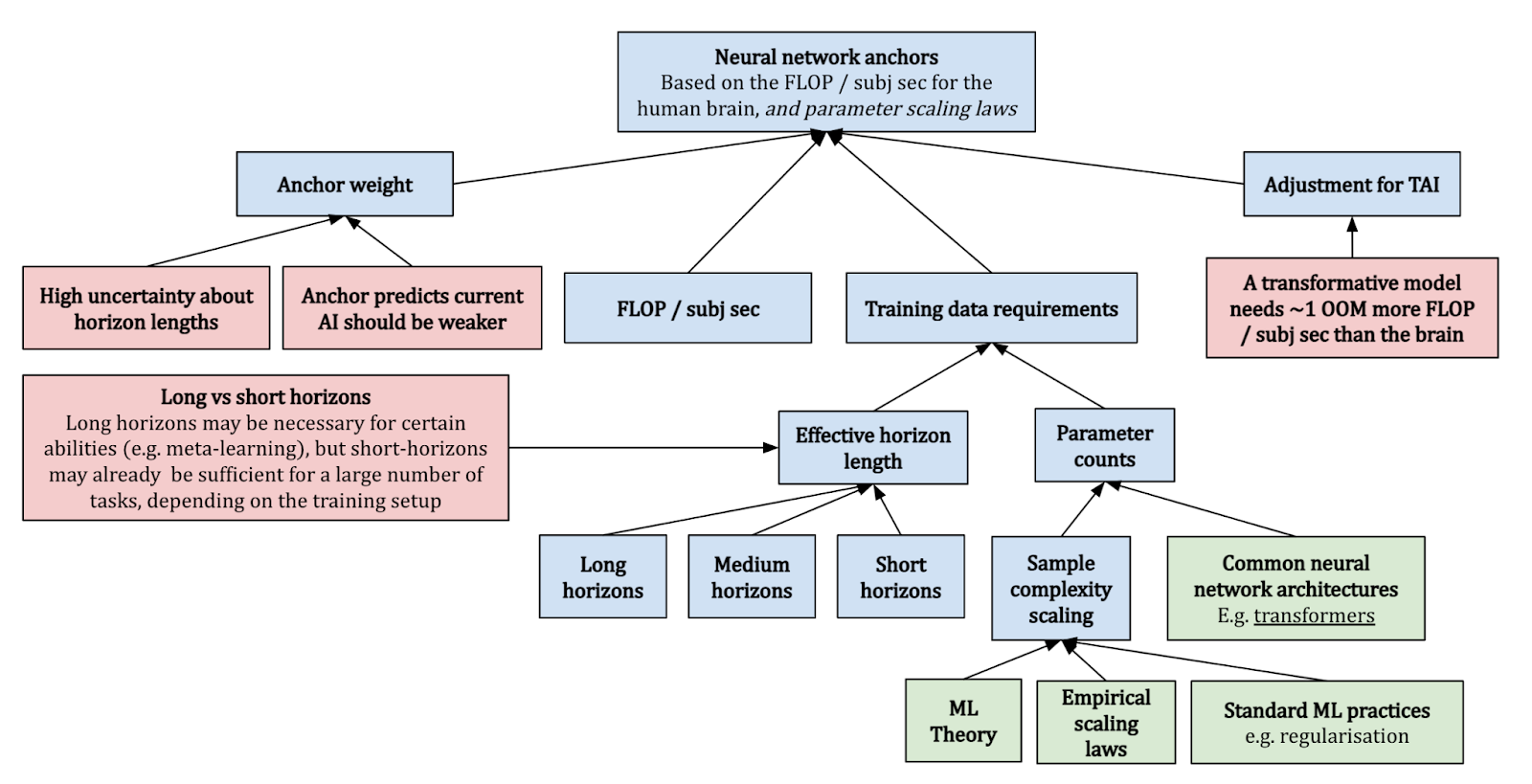 - Neural network anchors7: TAI should perform roughly as many FLOP / subj sec as the human brain, and have a similar ratio of “parameters” to “FLOP / subj sec” as today’s neural networks do. There are actually three anchors here, as we’ll later see.