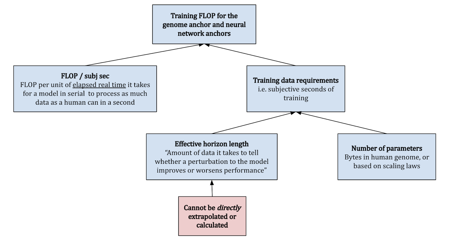 - Genome anchor: Anchor to the processing power of the human brain, set the number of parameters = number of bytes in the human genome, and extrapolate the amount of training data required using the same empirical scaling laws mentioned above and assuming a long horizon length (one “data point” = multiple years)