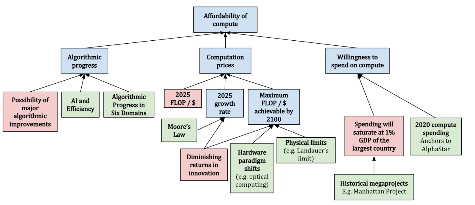 - Affordability of compute: How likely is it that we’ll be able to afford the compute required to train a transformative model in a particular year?