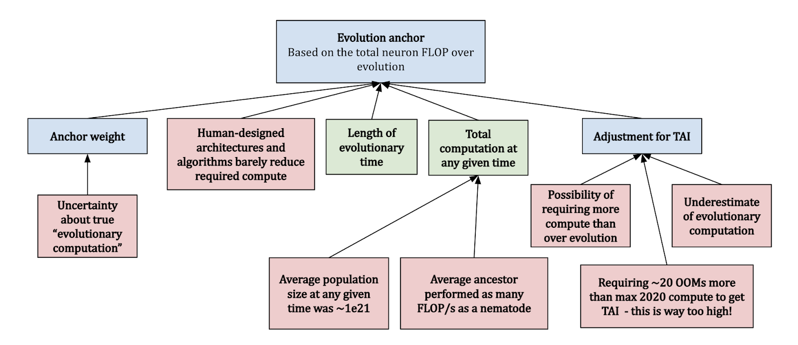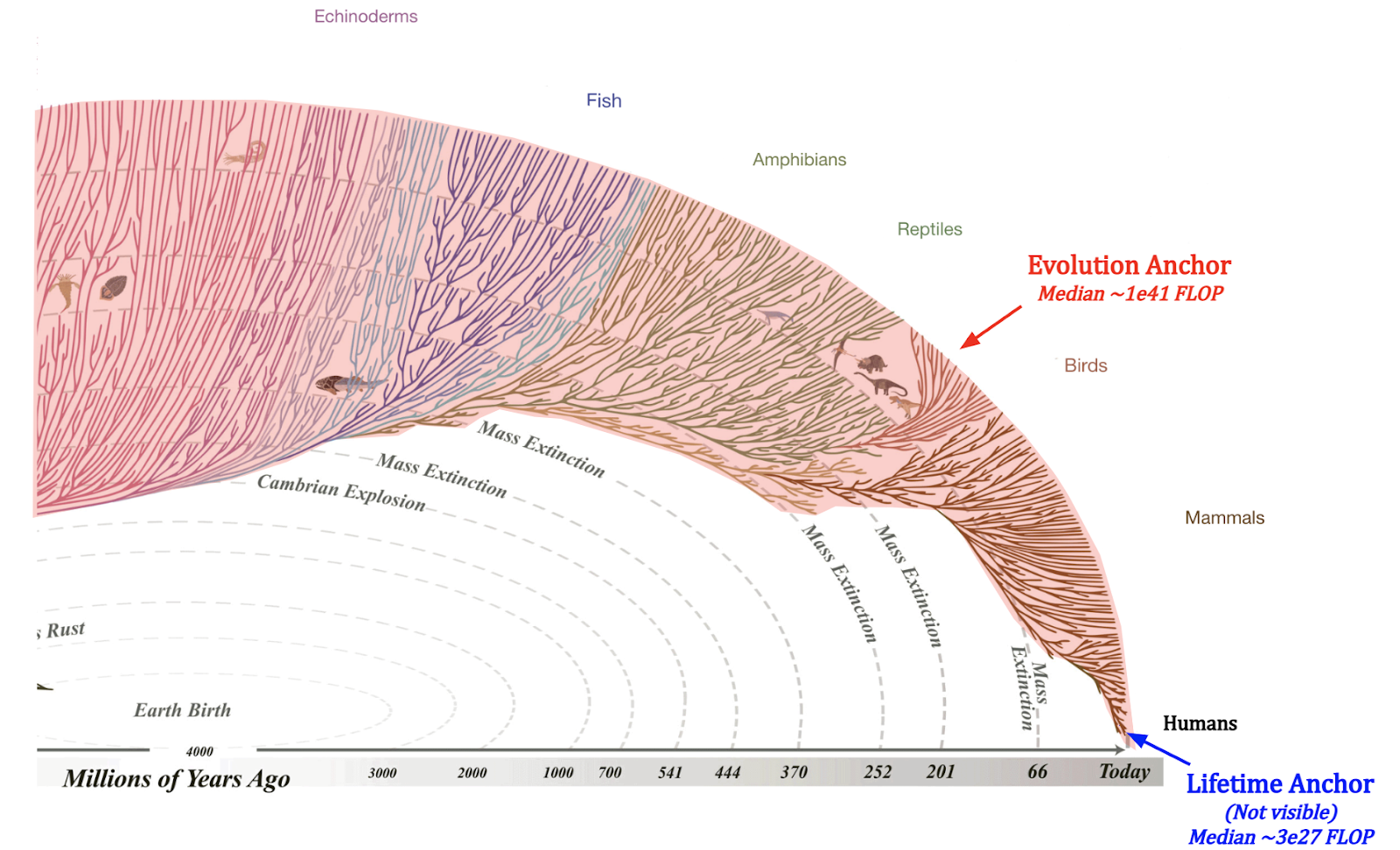 - Evolution anchor: The compute required to train a transformative model is roughly the total compute done over evolutionary history, starting from the first neurons. This interprets evolution as a really big search algorithm over a large space of possible neural architectures and environments, eventually stumbling across the human brain.