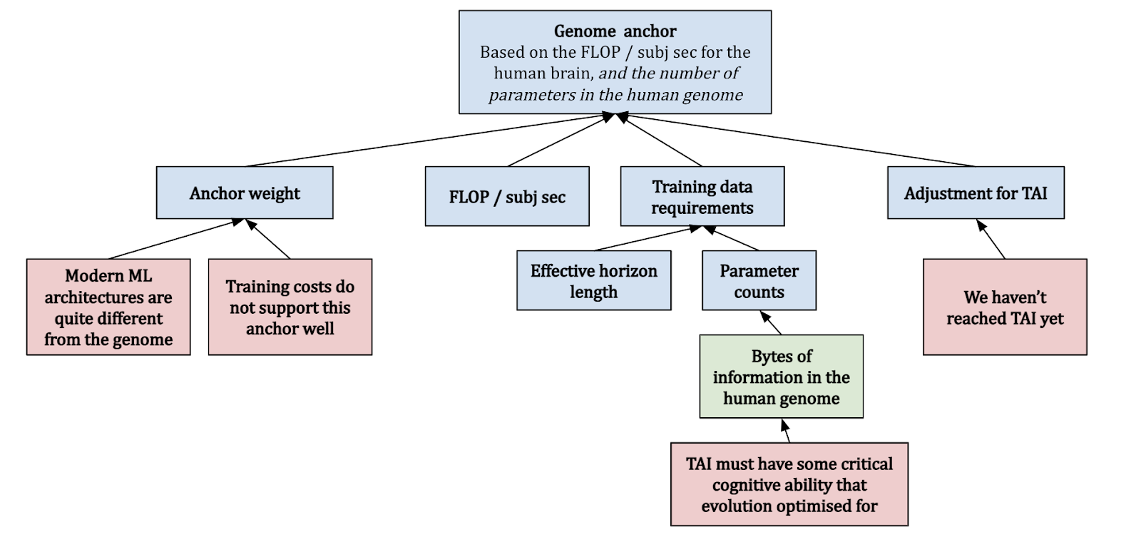 - Genome anchor: TAI should perform roughly as many FLOP / subj sec as the human brain, and have about as many parameters as there are bytes in the human genome.