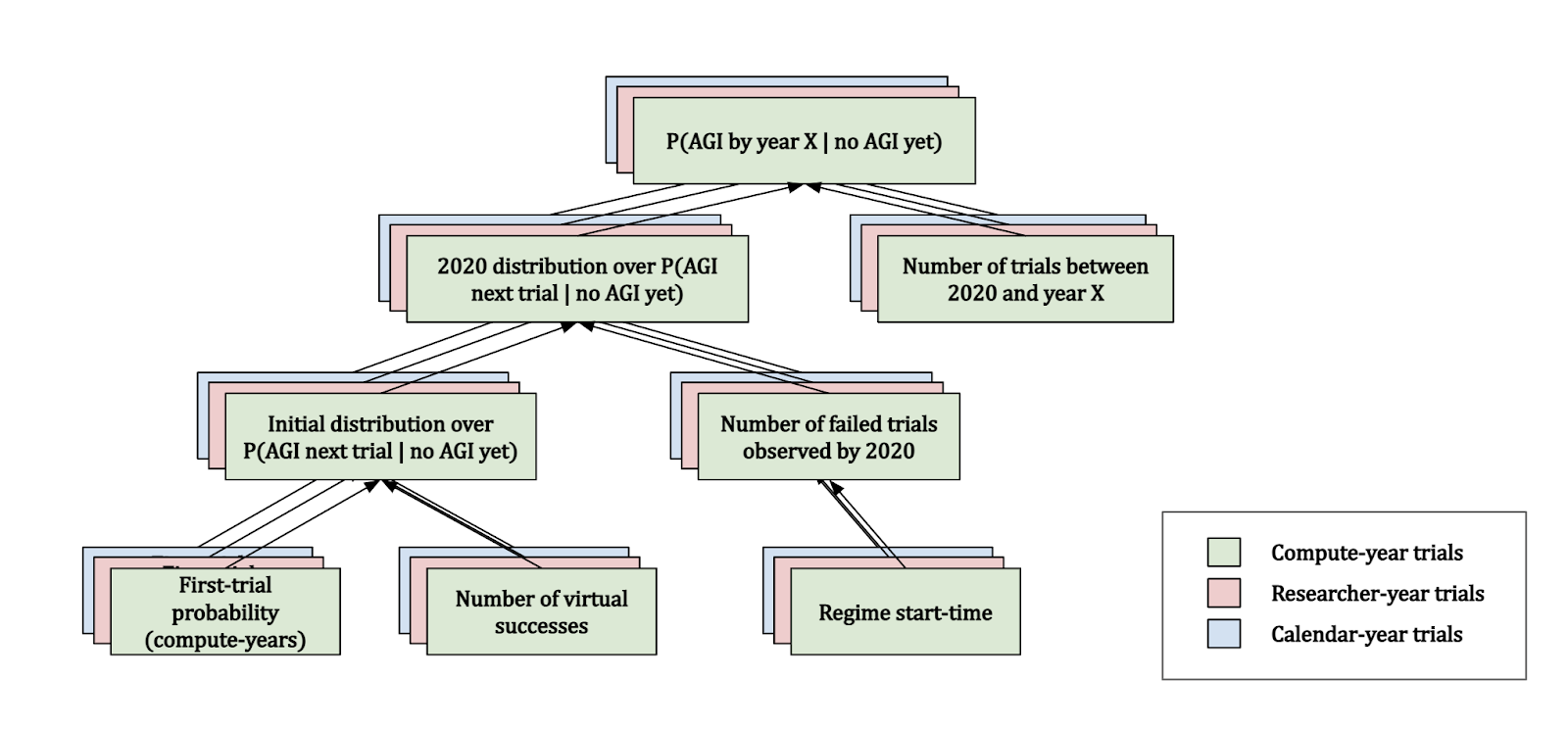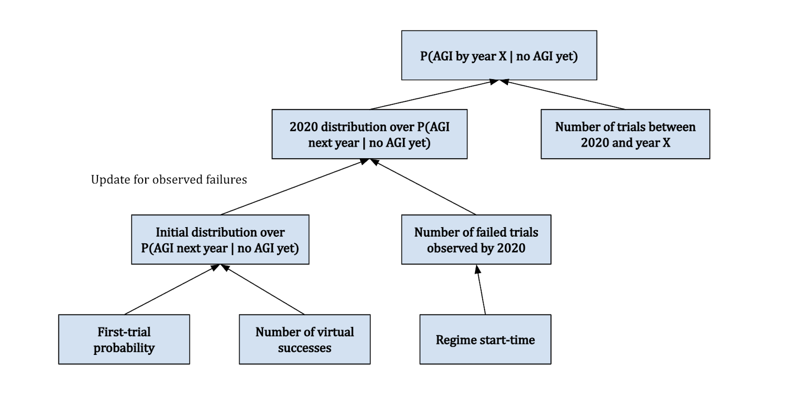 The diagram above shows how the framework is pieced together. The first trial probability and number of virtual successes are used to generate an initial distribution for the probability of AGI in the next year. We then update this distribution with 2020 evidence based on the trials we’ve observed, depending on our specified regime start-time. This gives us the 2020 distribution for \(P(\text{AGI next year (i.e. 2021)} \mid \text{no AGI yet})\). We combine this with the number of trials between 2020 and the year \(X\) that we’re interested in, to get the final distribution over \(P(\text{AGI by year} X \mid \text{no AGI in 2020})\). Note that this actually also depends on the trial definition – we’ll discuss how this fits into the diagram later.