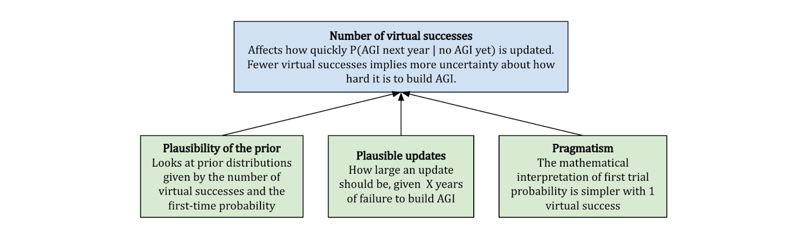 The number of virtual successes changes how quickly we should update based on our observation of failed trials.7 We want the size of this update to be reasonable, so we don’t want this number to be too large or too small. Davidson ultimately settles on 1 virtual success for most of the report, based on a combination of pragmatism, the plausibility of the prior8, and the plausibility about the update size given new evidence.9