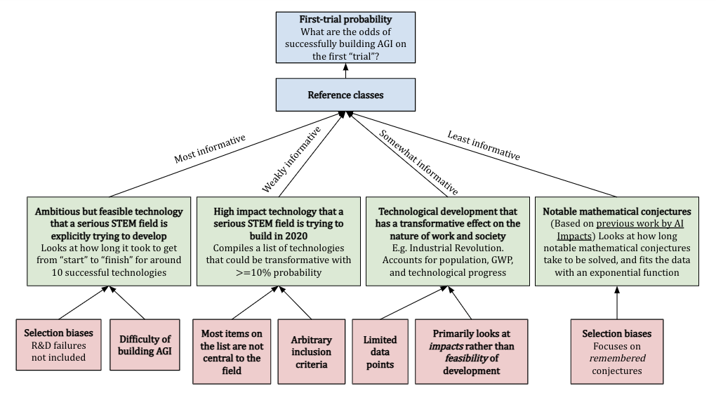 However, we don’t know what this value of \(p\) is, so we use a generalisation of Laplace’s rule of succession to estimate \(P(\text{AGI next year} \mid \text{no AGI yet})\). This is done by specifying a first-trial probability, the probability of successfully building AGI in the first year of AI research, together with the number of virtual successes, which tells us how quickly we should update our estimate for \(P(\text{AGI next year} \mid \text{no AGI yet})\) based on evidence. The framework leans very heavily on the first-trial probability, which is determined using a subjective selection of reference classes (more here).