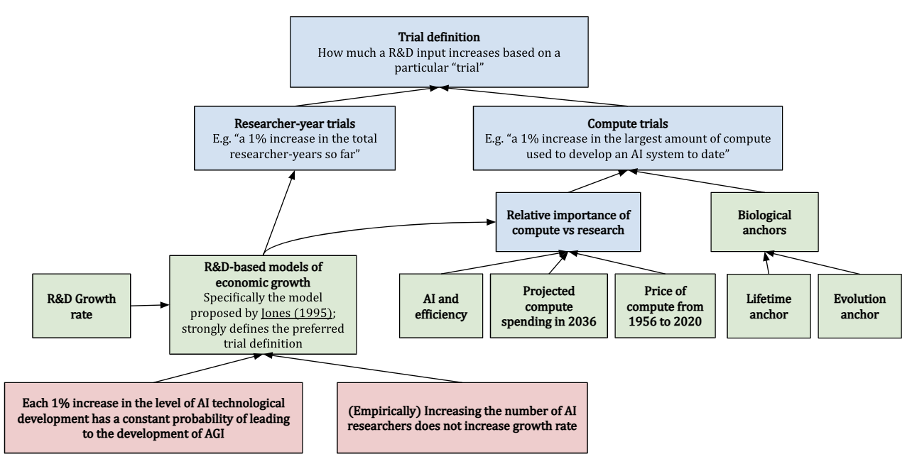 The final input to the framework is the trial definition, which specifies what exactly constitutes a single “trial” at building AGI. The initial approach we considered was in terms of calendar years, but there are reasonable alternatives, for example:
