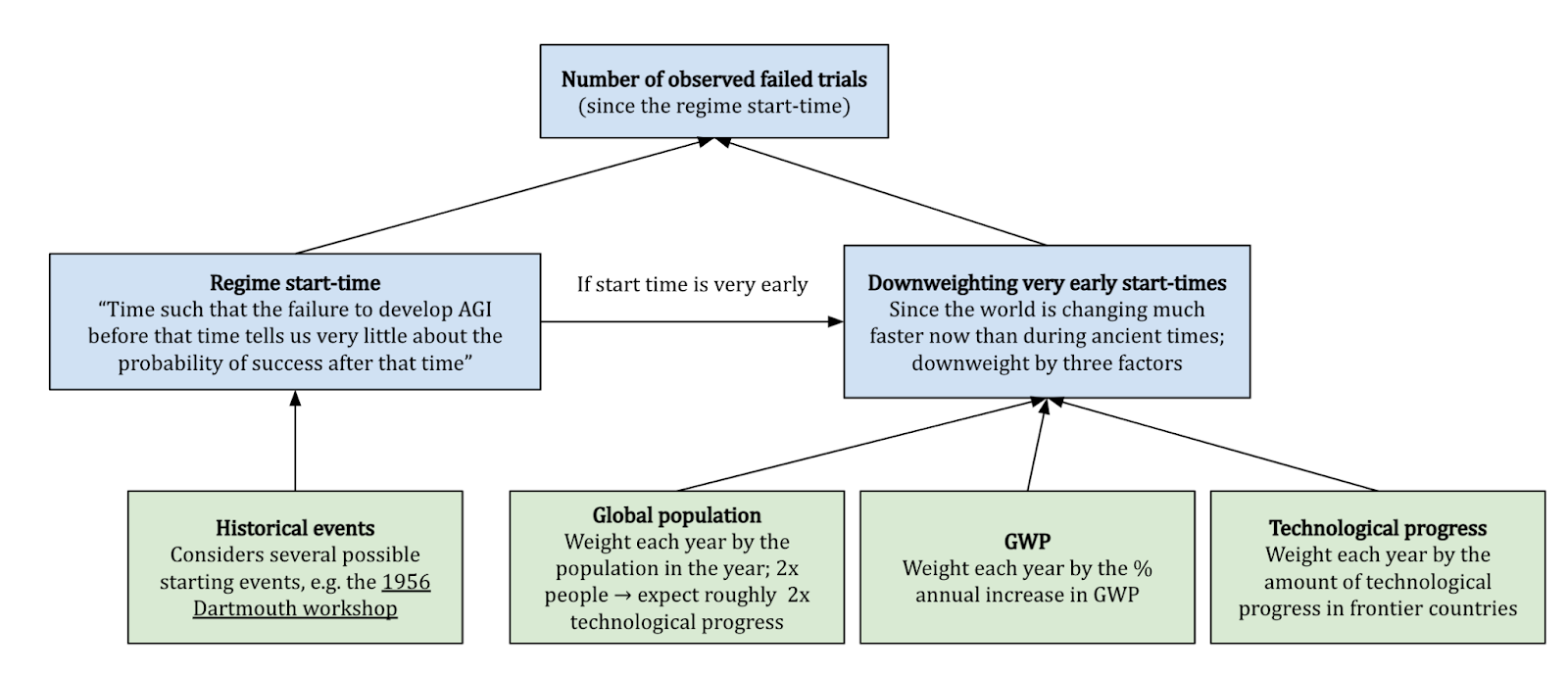 - Regime start-time: You can think of this as the time before which failure to develop AGI doesn’t tell us anything useful about the probability of success in later trials. We’ve been assuming this to be 1956, but this doesn’t have to be the case!