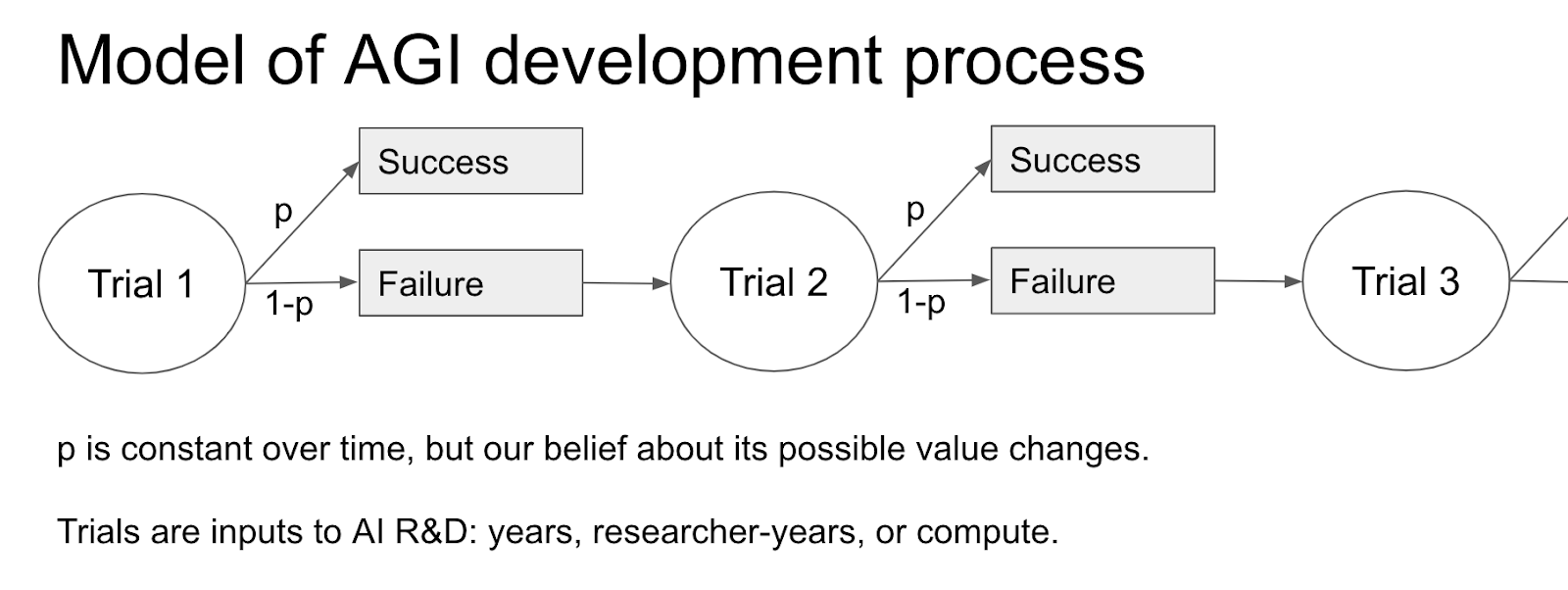 The framework in Semi-informative priors over AI timelines assumes a model of AGI development which consists of a sequence of Bernoulli trials, i.e. it treats each calendar year as a “trial” at building AGI with constant probability \(p\) of succeeding.