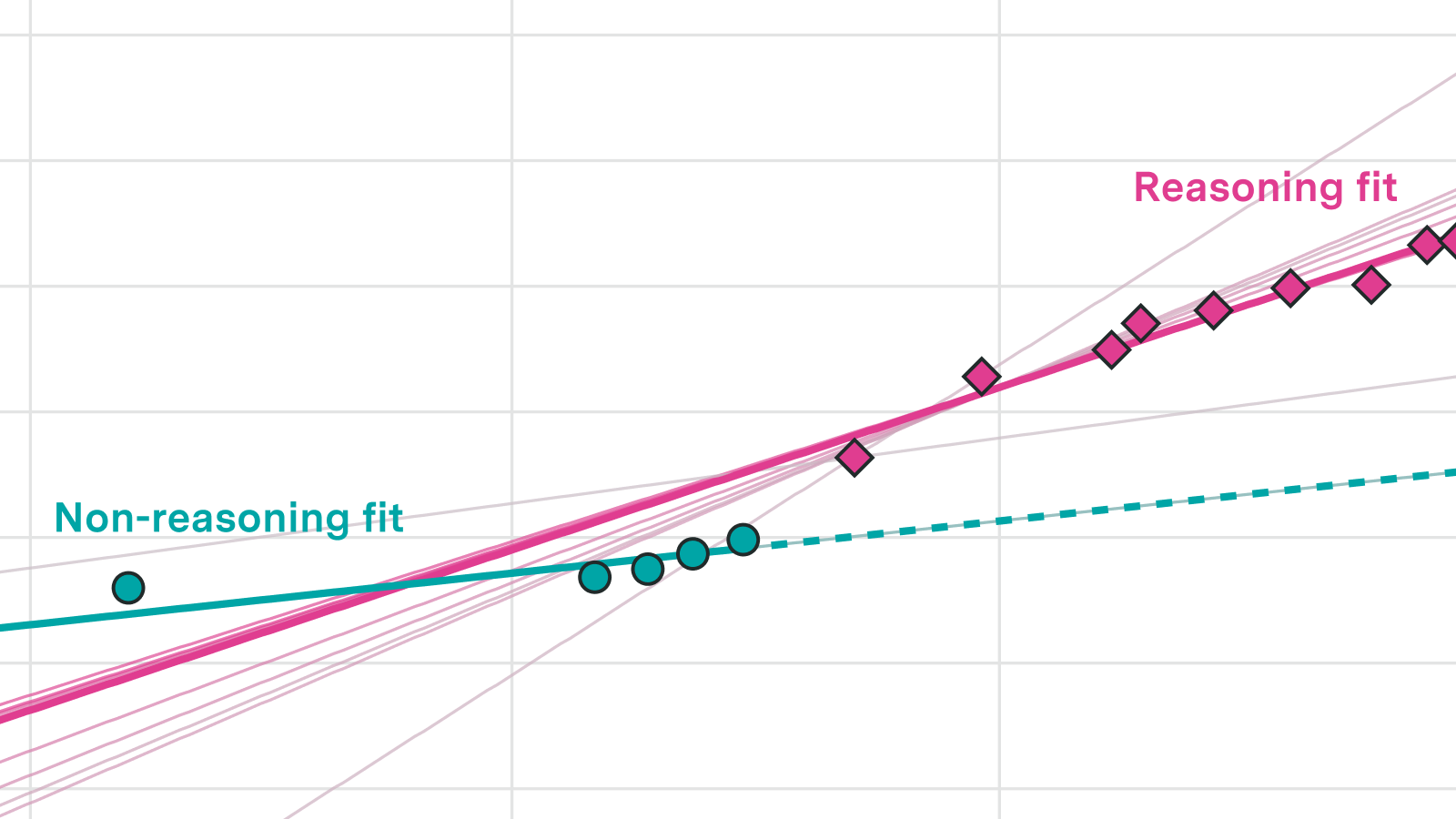 The best-performing model across these three metrics was a pair of independent linear trends: one for reasoning models and one for non-reasoning models. Reasoning models show both a one-off jump in performance and a roughly 2-3x faster trend compared to non-reasoning models. That said, for any individual metric several other superlinear fits also perform well, so we cannot pin down a precise growth rate.