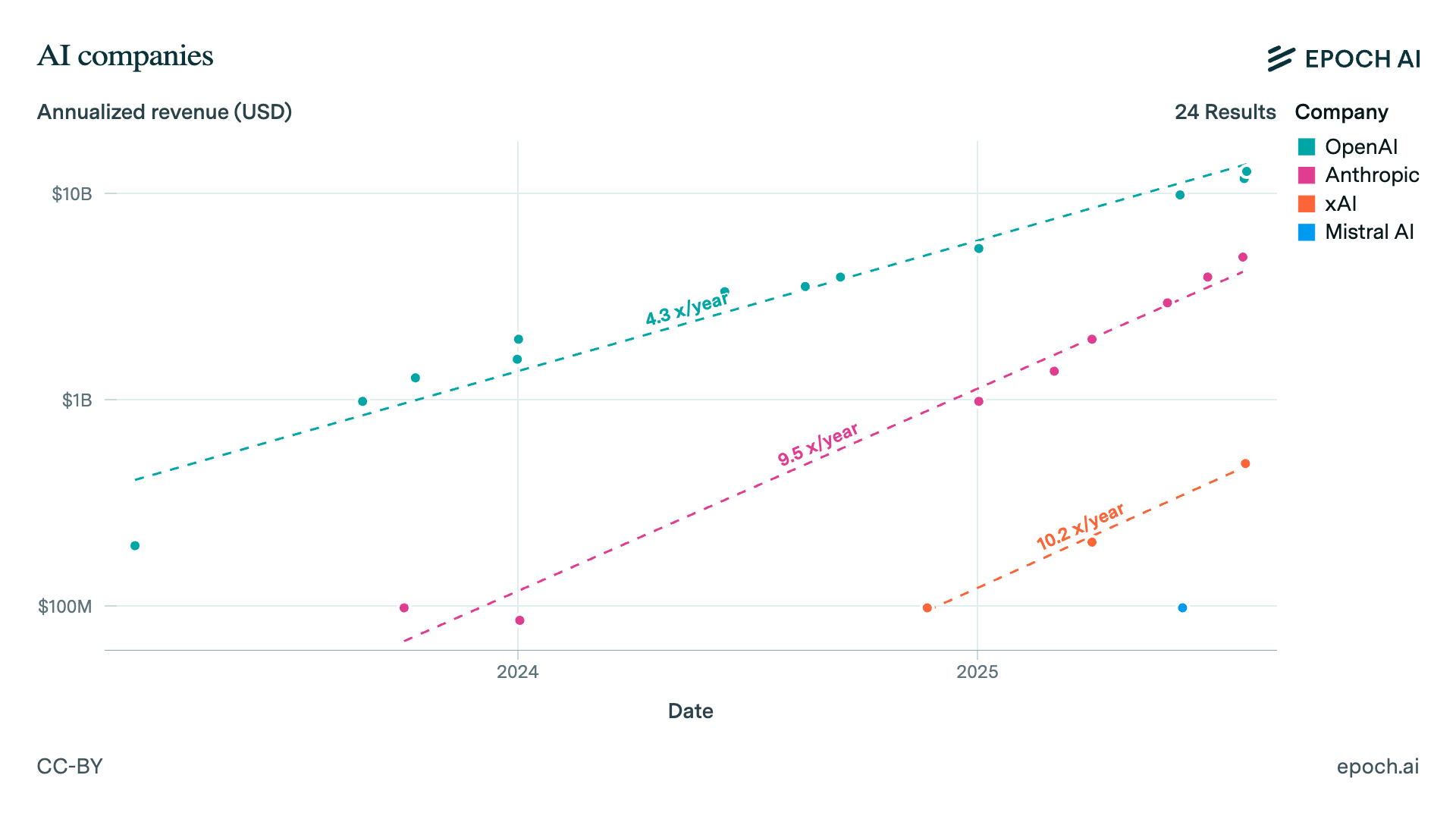 Our data shows that the combined revenues of OpenAI and Anthropic grew around 10x since early 2024. OpenAI’s annualized revenue reached $13 billion in August 2025, up from $5 billion at the beginning of the year, while Anthropic’s revenue has grown explosively so far in 2025, increasing from $1 billion to $5 billion in seven months! This revenue growth reflects the rapid commercialization and diffusion of AI.