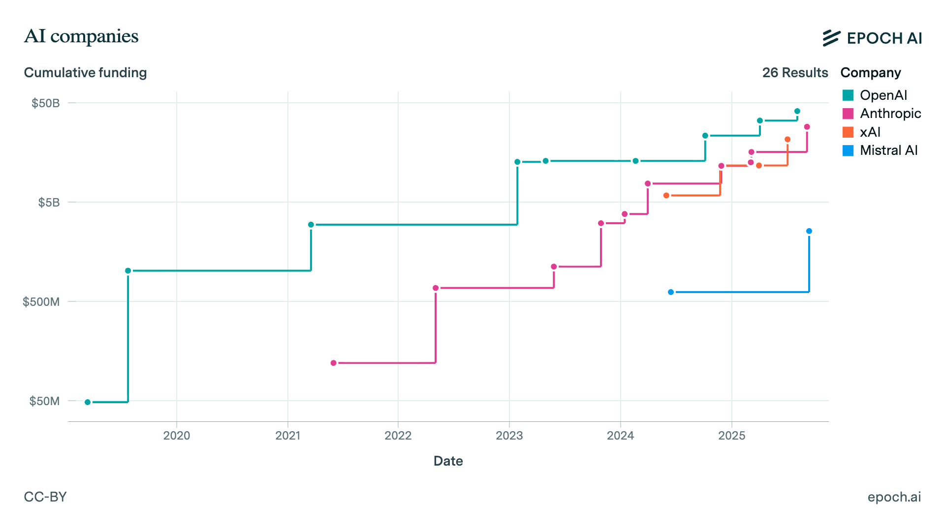 We also track funding rounds and valuations, showing the scale of capital flow into AI development. We’ve identified nearly $100 billion in debt and equity funding raised across frontier AI companies. Valuations have surged as well: OpenAI was recently valued at $300 billion, more than 10x its valuation from early 2023.