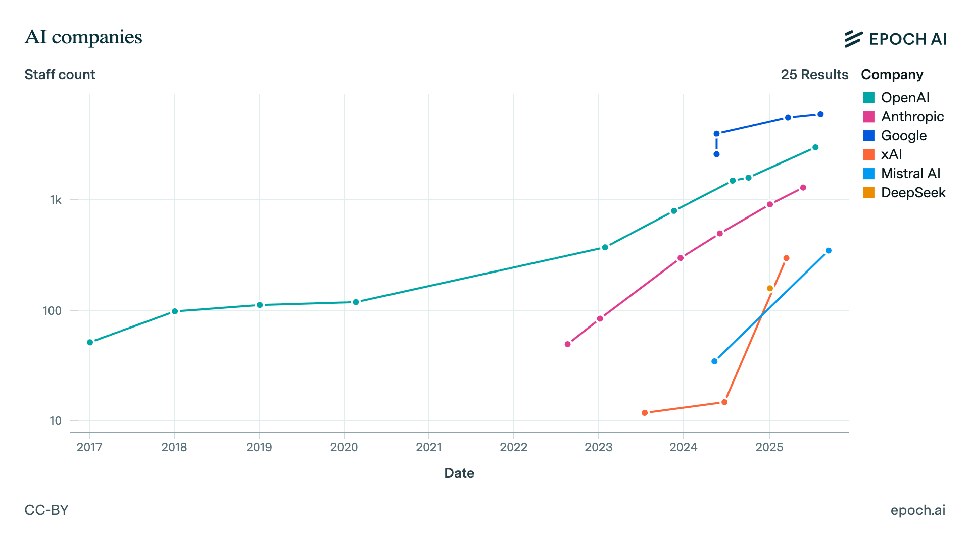 Our new AI Companies Data Hub tracks key economic and operational data, including frontier AI companies’ revenue, funding, valuations, staff counts, compute spending, and product usage