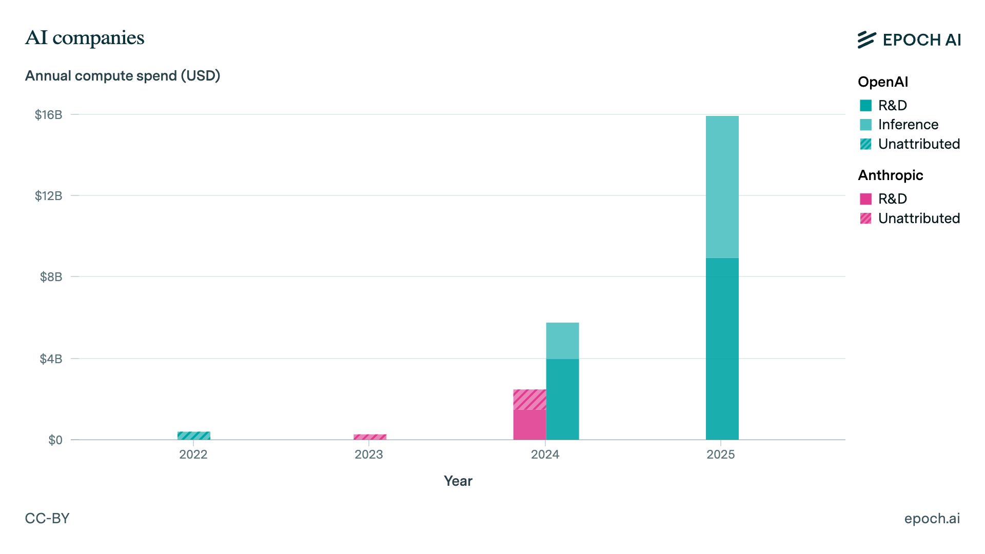 Finally, we collected reports of AI companies’ aggregate, operating compute expenses. OpenAI’s cloud compute bill in 2025 will reportedly exceed $15 billion, around 3x higher than their compute spending in 2024!