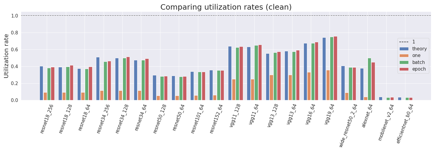 We can see that the utilization rates predicted by the theory are often comparable to the empirical measurements for batch and epoch. We can also see that the batch and epoch versions are usually very comparable while just forwarding and backwarding one sample is much less efficient. This is expected since the reason for larger batch sizes is that they utilize the GPU more efficiently.