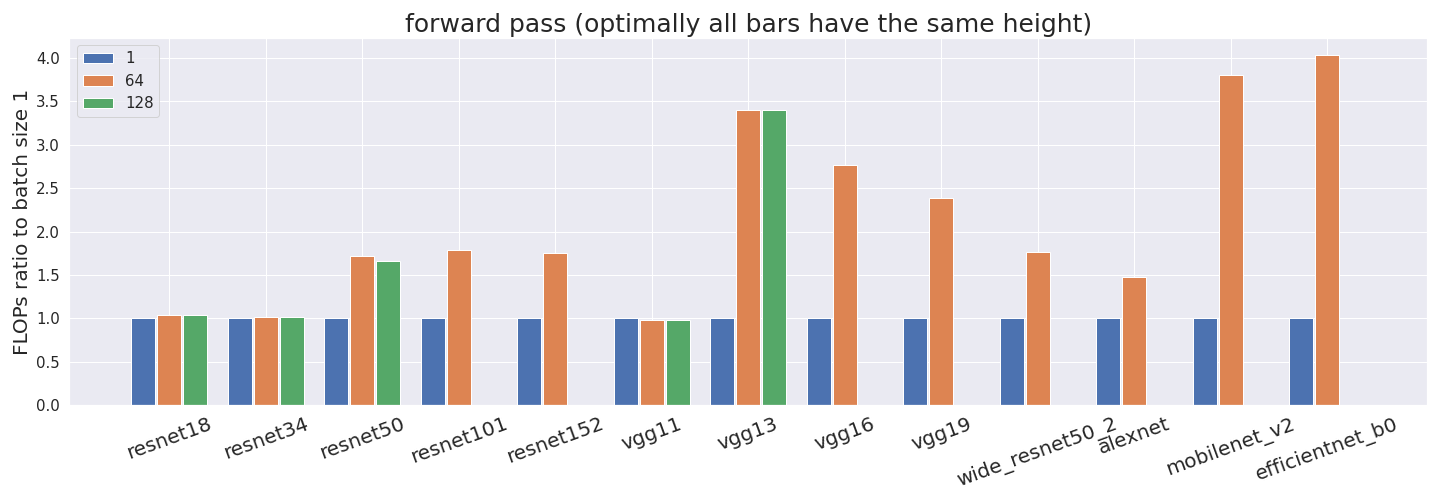 All FLOP estimates have been normalized by the batch size. Thus, if our profiler counted correctly, all bars would have exactly the same height. This is not what we observe in some networks, which suggests that something is off. Some networks don’t have estimates for a batch size of 128 since it didn’t fit into the GPU memory.