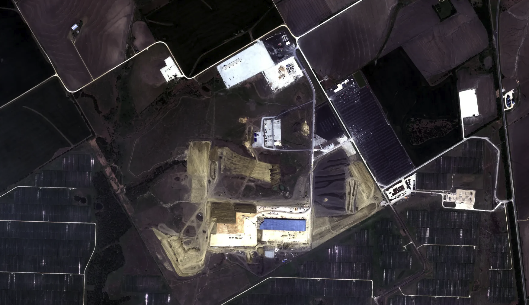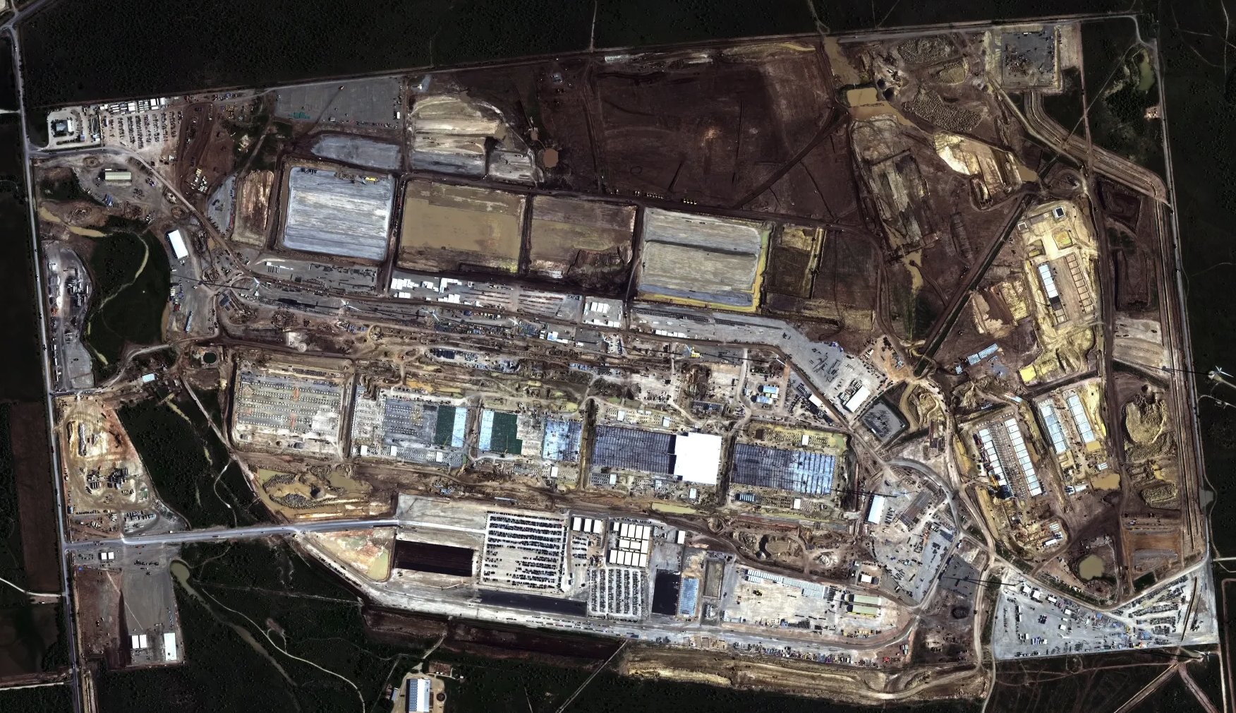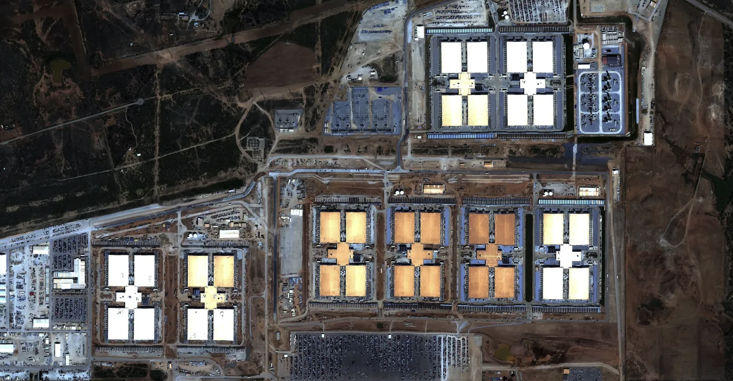 SoftBank subsidiary SB Energy is building and operating what is described as a “fast-build” site in Milam County, Texas, around 70 miles (110 kilometers) northeast of Austin. A satellite image from March shows steel framing and roofing for the first building (visible as a blue rectangle). Regulatory filings indicate this building will be delivered by October.