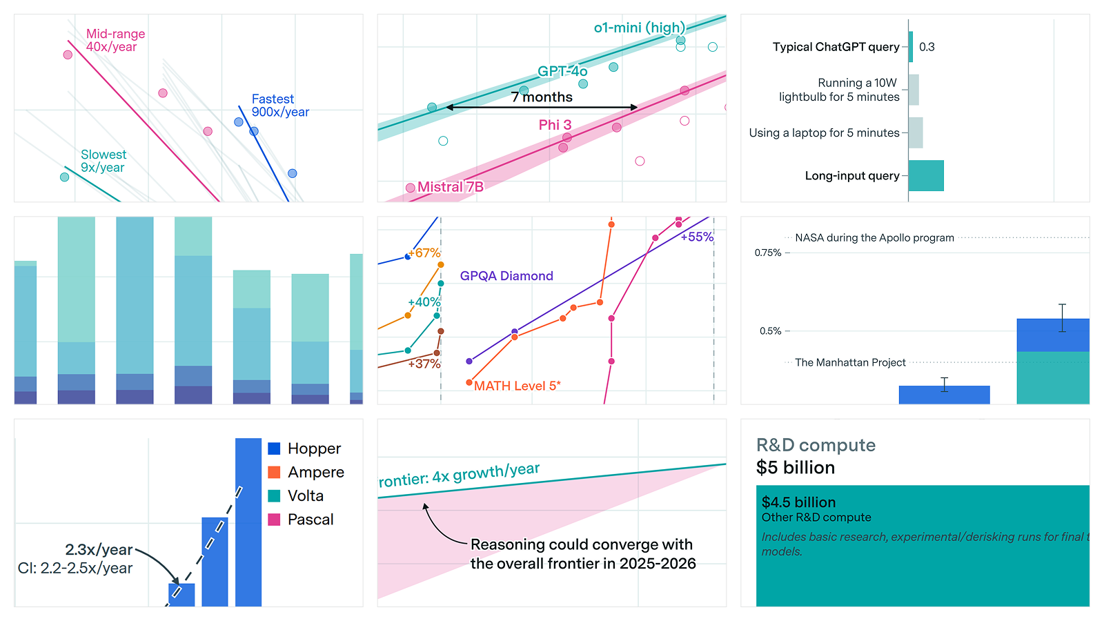 🠊 Why this matters: Three days after we published this post, DeepSeek attracted far wider attention by releasing a reasoning model, R1. This model matched the performance of OpenAI’s o1 while using what we presume is a fraction of the development cost. The innovations they introduced illustrate the patterns of training compute efficiency, whereby year-to-year models become 3× cheaper to develop because of new training techniques and data improvements.