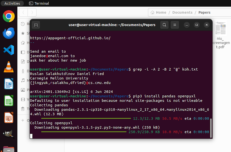 Looking at the official leaderboard, models with access to code execution tools score considerably higher than GUI-only agents. We observe many cases of these models using software packages that might help avoid GUI-use, such as openpyxl for manipulating spreadsheets. We actually also observe some cases of models without code execution tools included in their scaffold nonetheless downloading such packages. The screenshot below shows Claude Sonnet 4 installing openpyxl and pandas for a task that asks for contact information to be extracted from a set of documents and organized in a table in Excel.