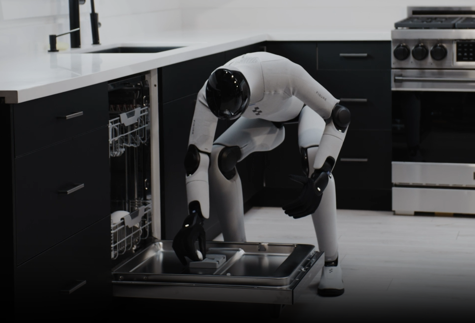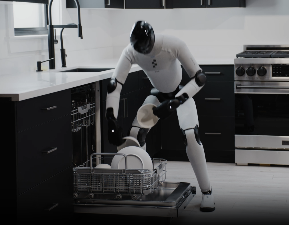 Figure has the most complete dishwasher demonstration: loading and unloading dishes, adding detergent, and starting a wash cycle. (see images below) It moves glasses, bowls, and plates between the sink, dishwasher, and cabinets. The main limitation is that it only handles larger items, not small cutlery like forks or knives. Speed is roughly 40% slower than humans. Figure has not shown transfer to new kitchens, though it has connected the OpenAI API to their robots to help them understand their progress, which may help with generalization.