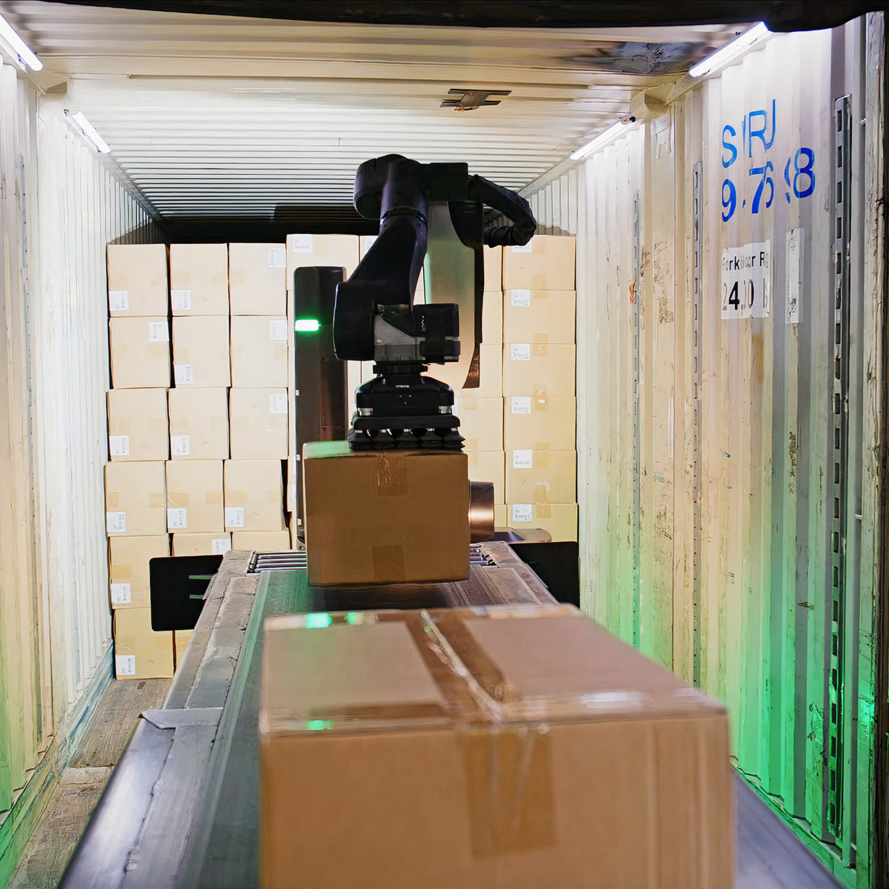 There is also a notable robot able to handle heavy boxes that vary in weight: Boston Dynamics Stretch (estimated $300,000–500,000) unloads containers with heavy cardboard boxes in real deployments like GAP warehouses, (see image below) taking boxes from containers to conveyor belts at speeds that appear faster than humans. The main limitation is that Stretch is only autonomous while unloading—an employee must bring it to the right location.