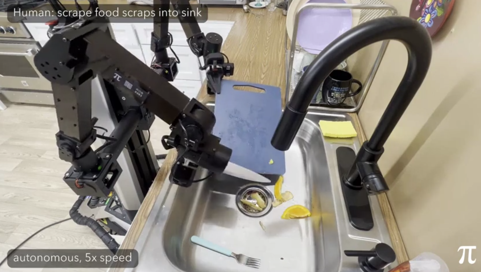 Physical Intelligence has shown countertop and item cleaning: moving dirty items to the sink, cleaning a greasy pan, wiping surfaces with sponges or towels, and storing items in cabinets and drawers. (see images below) PI claims some of these demos were done in homes not present in training data, suggesting that the robot can generalize to new locations, though this is not claimed for the pan cleaning. However, transferring to new locations may be easier than handling novel object states: different dishes, varying amounts of food residue, a nearly-full dishwasher versus a nearly-empty one. These variations have not been tested.
