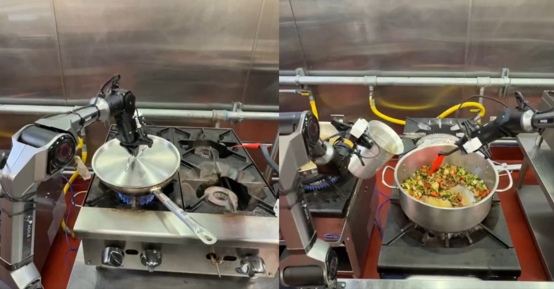 Current capabilities: Several robots have demonstrated individual cooking skills. Zippy (see image above) is used by chefs, including a two-star Michelin chef, to cook meat on a plancha. It adapts its behavior to the type of ingredient in a pan or pot and can use specialized cooking hardware like a flat-top griddle or a tilting skillet. Other robots have demonstrated making a peanut butter sandwich, making an omelet, and cooking shrimp in a pan.
