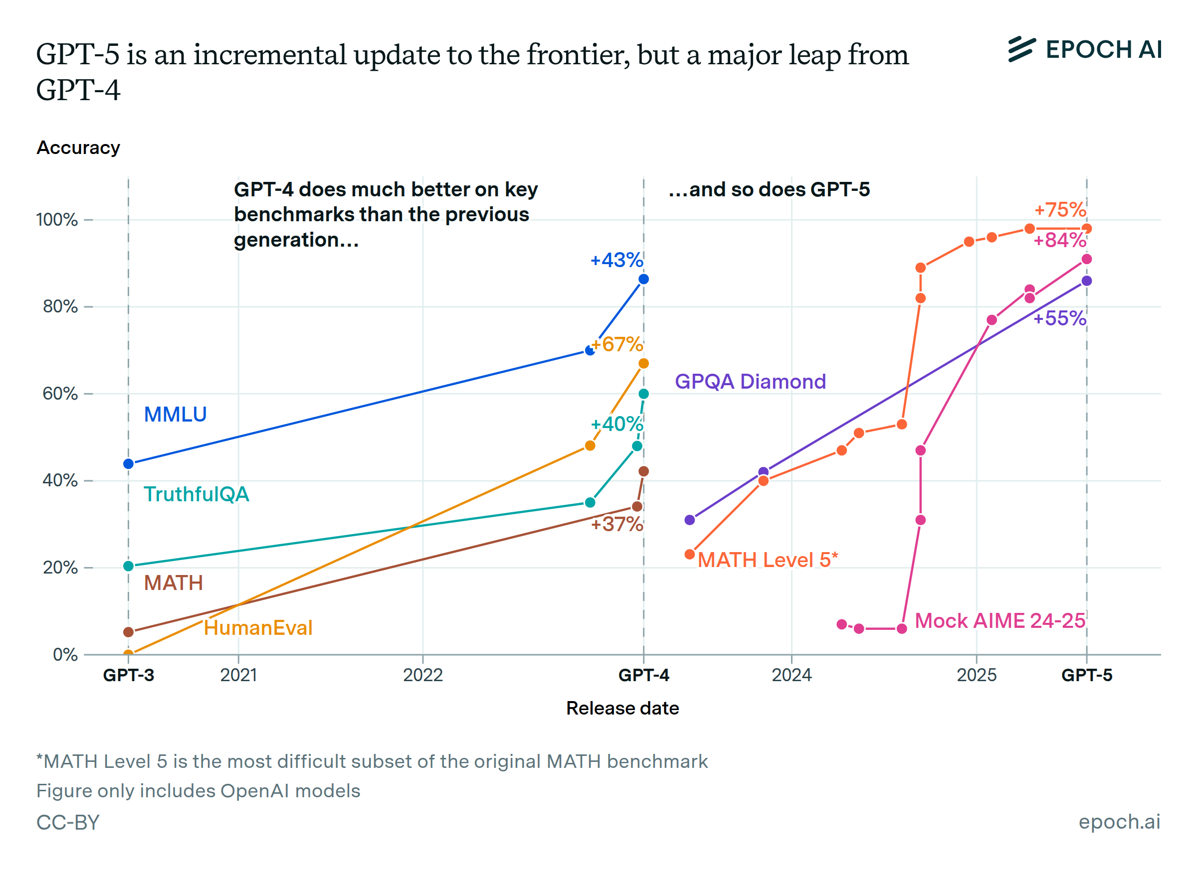 GPT-5 and GPT-4 were both major leaps in benchmarks from the previous generation