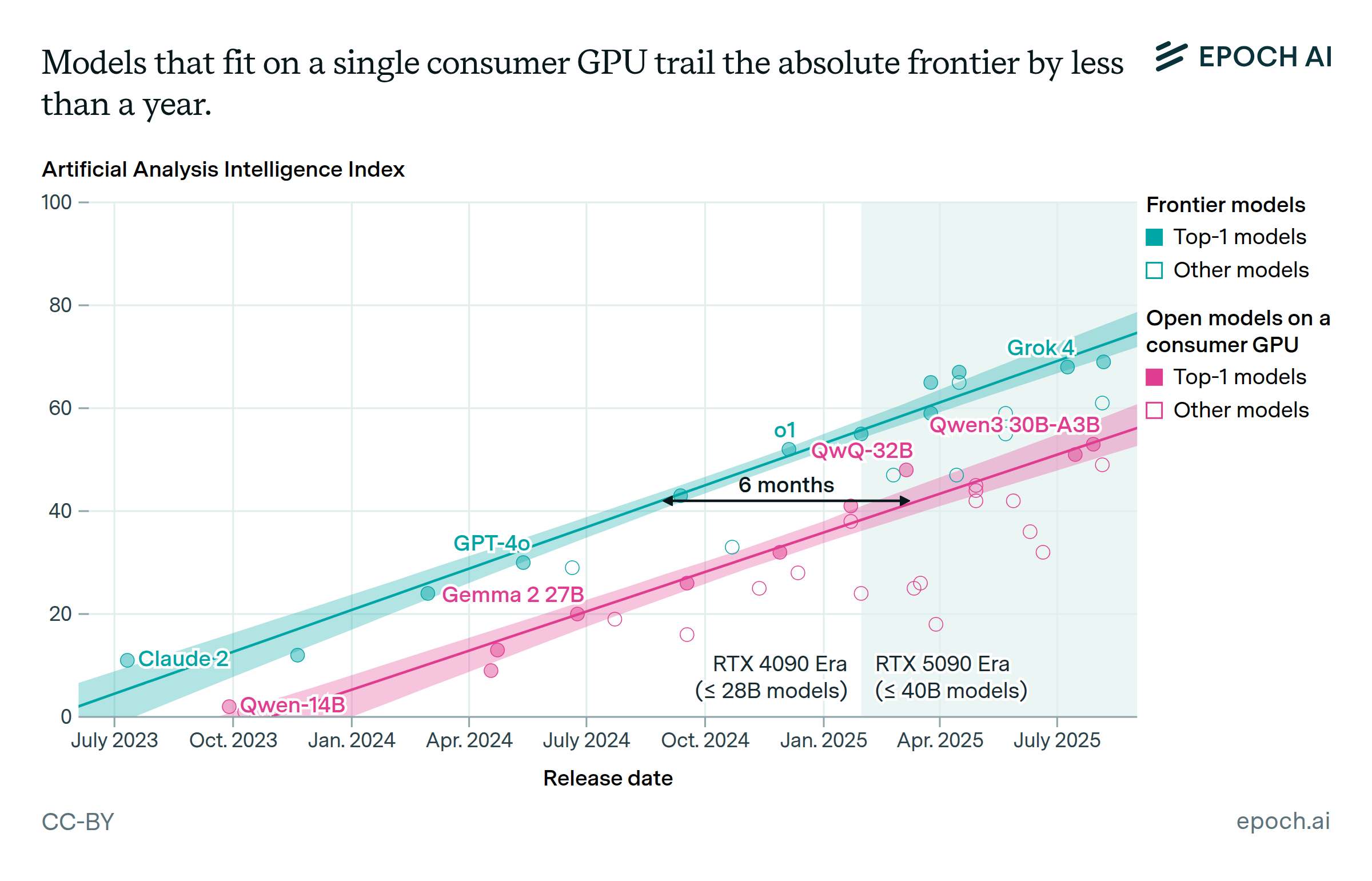 Using a single top-of-the-line gaming GPU like NVIDIA’s RTX 5090 (under $2500), anyone can locally run models matching the absolute frontier of LLM performance from just 6 to 12 months ago. This lag is consistent with our previous estimate of a 5 to 22 month gap for open-weight models of any size. However, it should be noted that small open models are more likely to be optimized for specific benchmarks, so the “real-world” lag may be somewhat longer.
