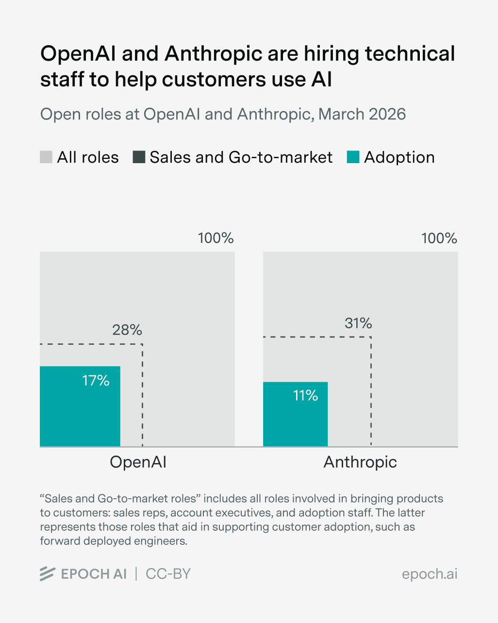 One subcategory has grown especially fast: technical roles dedicated to helping customers actually adopt AI. Both companies are now hiring roles such as AI Success Engineers, Partner AI Deployment Engineers, Solutions Architects and Forward Deployed Engineers, designed to help customers find opportunities to use AI and integrate it into their businesses. Over the past year, the share of open roles dedicated to adoption increased from 5% to 11% at Anthropic and from 11% to 17% at OpenAI. This suggests customers are struggling to fully utilize OpenAI and Anthropic’s products, and an important aspect of bridging this gap is to educate customers on what is possible.
