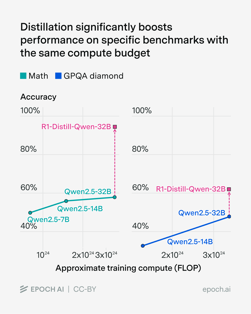 On MATH and GPQA Diamond, we see enormous efficiency gains — requiring several times less pre-training compute for GPQA, and multiple orders of magnitude less for MATH. So at first glance, distillation seems like it could be a huge deal for crossing the ten-fold compute gap to the frontier.