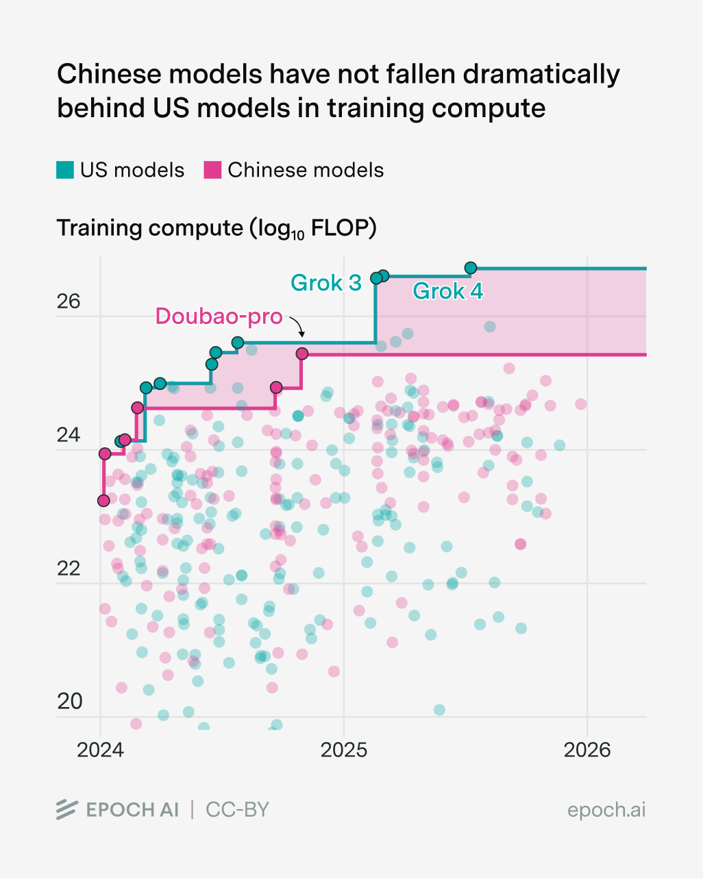 - The best US and Chinese models aren’t always trained with the most compute. For example, Grok 3 and 4 are probably also inefficient for their size, and I’d guess the same is true for Doubao Pro.