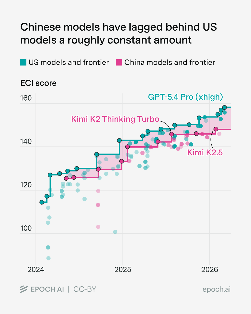 This of course hinges on a huge open question: how will the compute gap evolve over time? So far I think it’s not grown massively, and I think this is why they’ve not fallen far behind in capabilities to the frontier, as measured by the Epoch Capabilities Index (a fancy aggregation of benchmark scores):