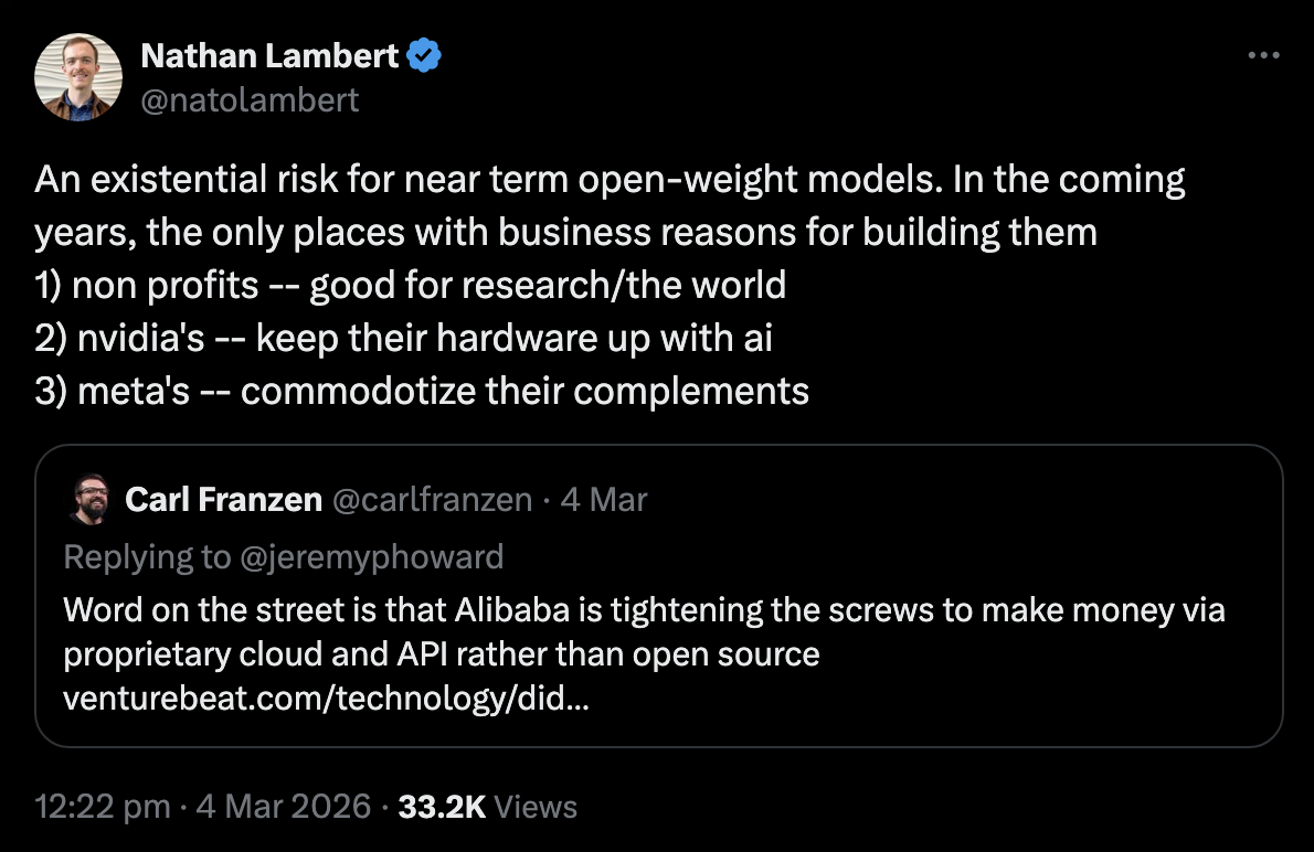 As far as I can tell, it’s not the case that Alibaba now only releases closed models — they have a hybrid structure where most models are open, but their best models are closed. This isn’t totally new either — it’s been the case since mid-2024.