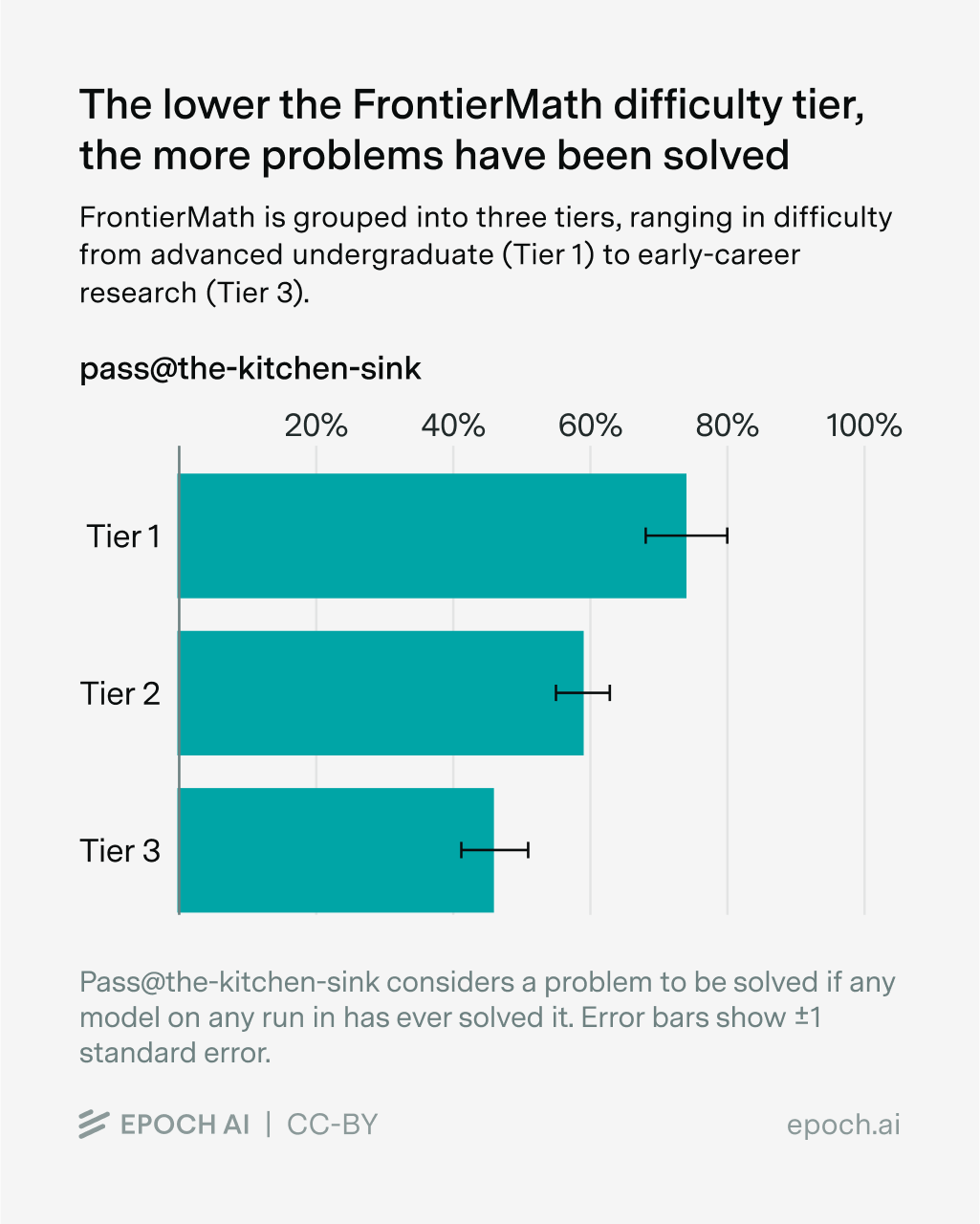 Returning to the 57% of solved problems, we observe the expected pattern across the FrontierMath difficulty tiers: lower tiers have higher solve rates.
