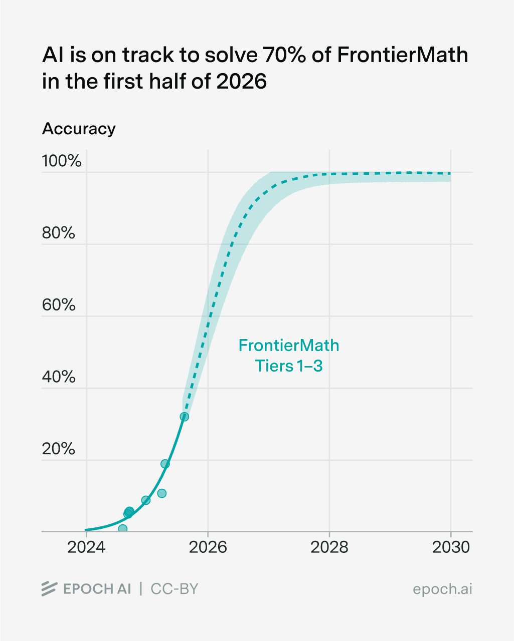 Epoch recently published a report on how we expect AI to look in 2030, which included the following projection of FrontierMath performance.