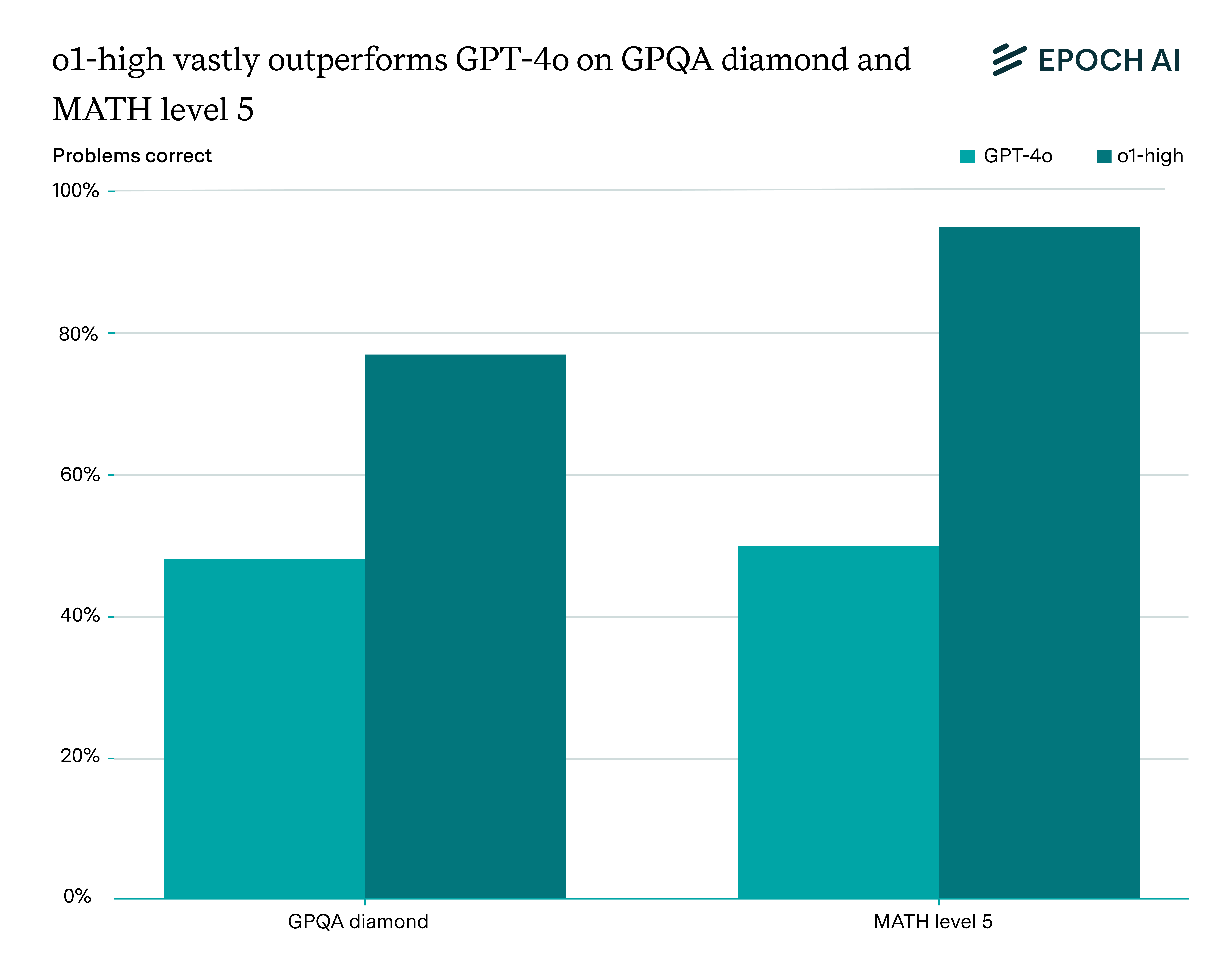 In current language models released by frontier AI labs, it’s likely that reasoning training yields higher marginal capability returns than pre-training. We can see this by looking at major model releases over the last year.3 Consider the language model GPT-4o and its counterpart o1-high, which has undergone additional reasoning training and inference scaling. Despite using a small amount of extra compute,4 performance jumps from 48% to 77% on the GPQA Diamond benchmark, and from 50% to 95% on MATH Level 5. While the effectiveness of reasoning training relies on a strong pre-trained base model, once that foundation exists, the marginal returns per FLOP are much higher than further pre-training. Had OpenAI instead used the same amount of additional compute to simply continue pre-training, the performance would have barely changed.