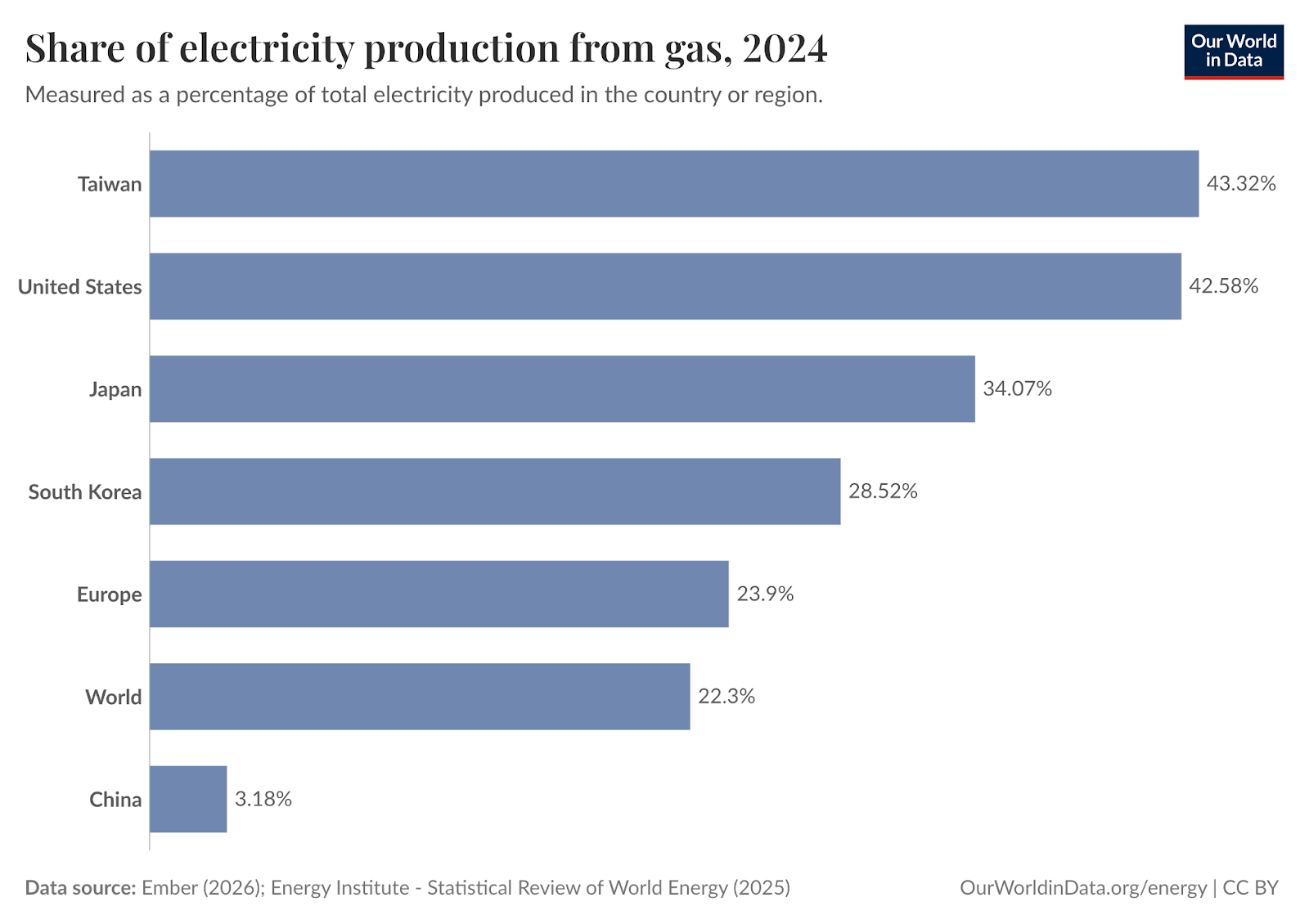 Not all natural gas is liquefied, so the 20% shock to LNG is a smaller share of overall world gas, but LNG is necessary to export gas to an island like Taiwan or a pseudo-island like South Korea.