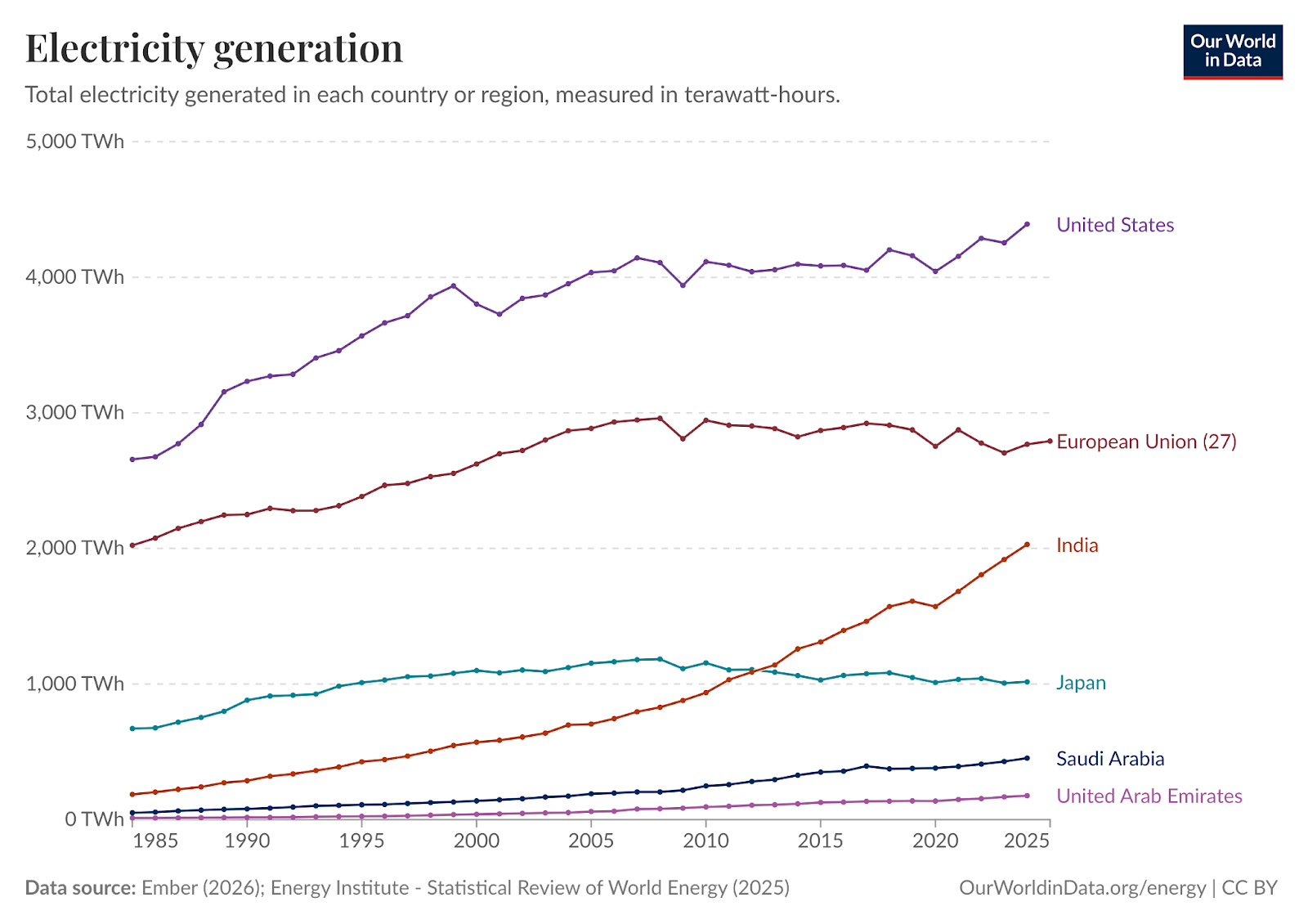 This is potentially quite significant. Stargate UAE alone is a large project, initially planned for >1 GW of power capacity with an eventual goal of 5 GW. But I am personally somewhat skeptical that the Gulf was ever going to host more than, say, 10% of the world’s AI data centers. Gulf states like Saudi Arabia and the UAE are very wealthy and energy-abundant relative to their small populations, but they are fundamentally much smaller in terms of GDP (~2% of the world total), total electricity production, workforce, or geographic area than regions like the US, the rest of Asia, or Europe.13
