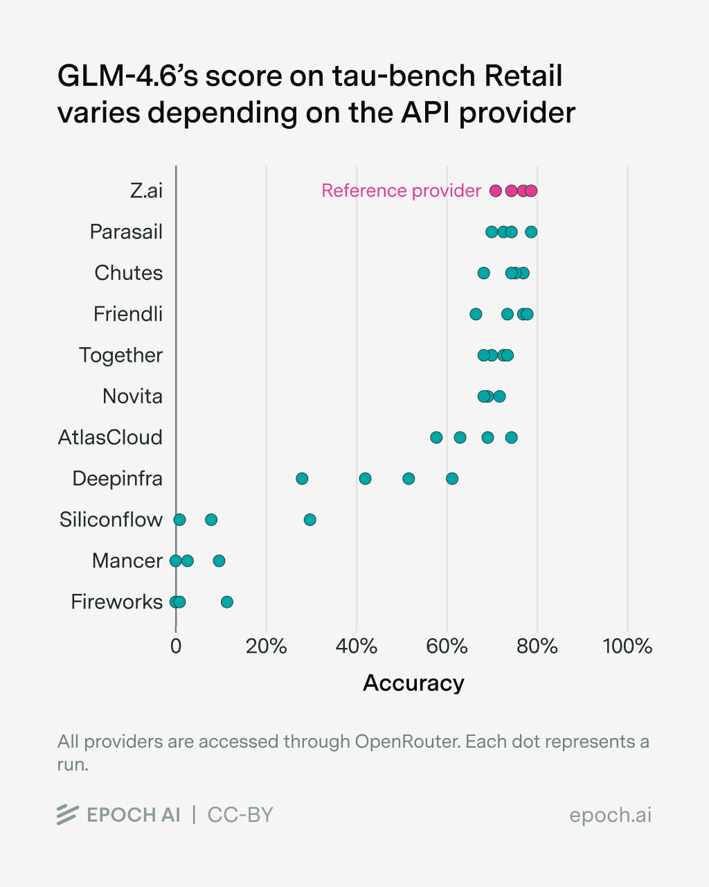 Aside from these errors, we find that providers are noticeably worse at serving newer models, in our case GLM-4.6, compared to established models such as Qwen3. This is consistent with other model releases, which are accompanied by bugs that are then fixed over time. However, independent benchmark organizations want to evaluate new models as soon as possible.