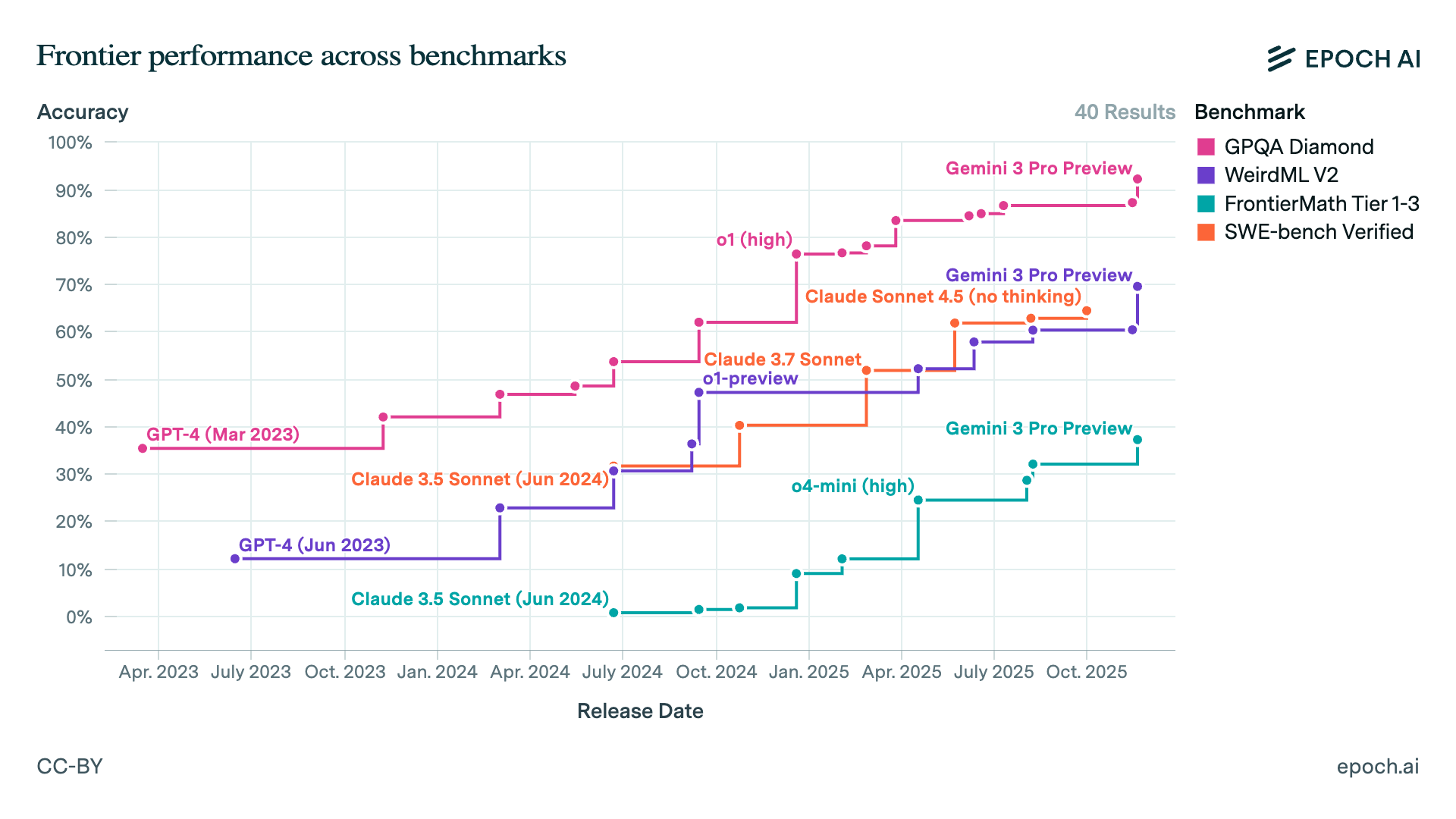 Our database of benchmark results, featuring the performance of leading AI models on challenging tasks. It includes results from benchmarks evaluated internally by Epoch AI as well as data collected from external sources. Explore trends across time, by benchmark, or by model.